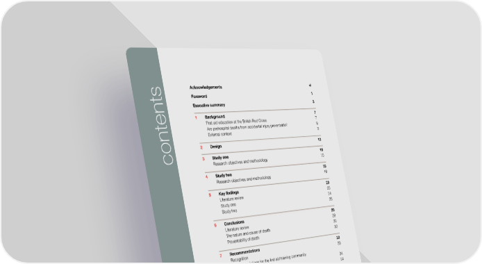 Acknowledgements vi Foreword 1 Executive summary 3 1 Background 7 First aid education at the British Red Cross 7 Are prehospital deaths from accidental injury preventable? 9 External context 9 2 Design 13 3 Study one 15 contents Research objectives and methodology 15 4 Study two 19 Research objectives and methodology 19 5 Key findings 23 Literature review 23 Study one 24 Study two 26 6 Conclusions 29 Literature review 29 The nature and cause of death 30 Preventability of death 30 7 Recommendations 33 Recognition 33 Recommendations for the first aid training community, including the Red Cross 34 Recommendations for the Red Cross 34 Recommendations for decision-makers and policymakers 34 References 37