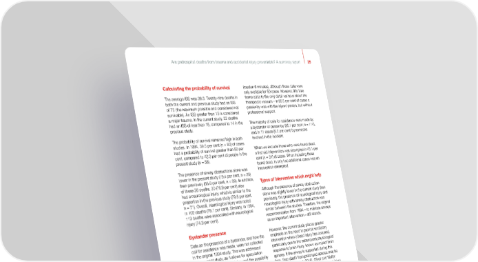 Are prehospital deaths from trauma and accidental injury preventable? A summary report 25 Calculating the probability of survival (median 6 minutes), although these data were only available for 50 cases. However, this time The average ISS was 38.3. Twenty-nine deaths in frame adds to the only detail we have about the both the current and previous study had an ISS therapeutic vacuum – in 95.5 per cent of cases a of 75 (the maximum possible and considered not passer-by was with the injured person, but without survivable). An ISS greater than 15 is considered professional support. a major trauma. In the current study, 22 deaths had an ISS of less than 15, compared to 14 in the The majority of calls for assistance were made by previous study. a bystander or passer-by (85.1 per cent, n = 114), and in 11 cases (8.2 per cent) by someone The probability of survival remained high in both involved in the incident. studies. In 1994, 39.5 per cent (n = 60) of cases had a probability of survival greater than 50 per When we exclude those who were found dead, cent, compared to 43.3 per cent of people in the a first aid intervention was attempted in 43.1 per present study (n = 58). cent (n = 31) of cases. When including those found dead, in only two additional cases was an The presence of airway obstructions alone was intervention attempted. lower in the present study (19.4 per cent, n = 26) than previously (58.6 per cent, n = 89). In addition, Types of intervention which might help of these 26 deaths, 20 (76.9 per cent) also had a neurological injury, which is similar to the Although the presence of airway obstruction proportion in the previous study (79.8 per cent, alone was slightly lower in the current study than n = 71). Overall, neurological injury was noted previously, the presence of neurological injury and in 102 deaths (76.1 per cent). Similarly, in 1994, neurological injury with airway obstruction was 113 deaths were associated with neurological similar between the studies. Therefore, the original injury (74.3 per cent). recommendation from 1994 – to maintain airways as an important intervention – still stands. Bystander presence However, the current study places greater Data on the presence of a bystander, and how the emphasis on the need to provide ventilatory call for assistance was made, were not collected intervention when a head injury has occurred, in the original 1994 study. This was addressed particularly due to the subsequent physiological in the current study, as it allows for speculation response to brain injury, known as impact brain around the moments after injury and the possibility apnoea. If the airway is supported during this for first aid intervention. time, then death from prolonged apnoea may be avoided (Wilson et al. 2016). Oliver and Walter A bystander was on the scene during or (2016) note that this critical phase of a head injury immediately after the point of injury in 44.8 per takes place in the first 10 minutes, although they 8 cent of deaths (n = 60). For an additional 20 also state that this is an arbitrary time reference people (14.9 per cent), a bystander was on the (Atkinson 2000). scene between minutes and an hour later. A passer-by was on the scene before the emergency The authors of the present study note the services in 95.5 per cent of cases. importance of the role of the bystander or passer-by in supporting the airway and controlling The average time taken for the emergency bleeding. services to arrive after call-out was 8.2 minutes 8 The time from injury to discovery is a subjective assessment of the time from the point of injury to someone being on the scene, based on the available evidence.