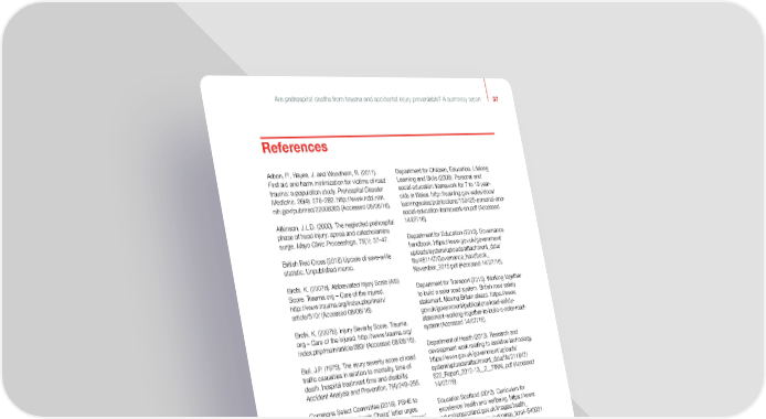 Are prehospital deaths from trauma and accidental injury preventable? A summary report 37 References Arbon, P., Hayes, J. and Woodham, R. (2011). Department for Children, Education, Lifelong First aid and harm minimization for victims of road Learning and Skills (2008). Personal and trauma: a population study. Prehospital Disaster social education framework for 7 to 19 year- Medicine, 26(4): 276–282. http://www.ncbi.nlm. olds in Wales. http://learning.gov.wales/docs/ nih.gov/pubmed/22008363 (Accessed 08/06/16). learningwales/publications/130425-personal-and- social-education-framework-en.pdf (Accessed Atkinson, J.L.D. (2000). The neglected prehospital 14/07/16). phase of head injury: apnea and catecholamine surge. Mayo Clinic Proceedings, 75(1): 37–47. Department for Education (2015). Governance handbook. https://www.gov.uk/government/ British Red Cross (2016) Update of save-a-life uploads/system/uploads/attachment_data/ statistic. Unpublished memo. file/481147/Governance_handbook_ November_2015.pdf (Accessed 14/07/16). Brohi, K. (2007a). Abbreviated Injury Scale (AIS) Score. Trauma.org – Care of the injured. Department for Transport (2015). Working together http://www.trauma.org/index.php/main/ to build a safer road system. British road safety article/510/ (Accessed 08/06/16). statement. Moving Britain ahead. https://www. gov.uk/government/publications/road-safety- Brohi, K. (2007b). Injury Severity Score. Trauma. statement-working-together-to-build-a-safer-road- org – Care of the injured. http://www.trauma.org/ system (Accessed 14/07/16). index.php/main/article/383/ (Accessed 08/06/16). Department of Health (2013). Research and Bull, J.P. (1975). The injury severity score of road development work relating to assistive technology. traffic casualties in relation to mortality, time of https://www.gov.uk/government/uploads/ death, hospital treatment time and disability. system/uploads/attachment_data/file/211647/ Accident Analysis and Prevention, 7(4):249–255. S22_Report_2012-13__2__FINAL.pdf (Accessed 14/07/16). Commons Select Committee (2016). PSHE to Education Scotland (2010). Curriculum for be statutory in all schools Chairs’ letter urges. excellence: health and wellbeing. https://www. http://www.parliament.uk/business/committees/ educationscotland.gov.uk/Images/health_ committees-a-z/commons-select/education- wellbeing_experiences_outcomes_tcm4-540031. committee/news-parliament-2015/phse-statutory- pdf (Accessed 14/07/16). letter-published-15-16/ (Accessed 14/07/16). Council for the Curriculum, Examinations and Flood, R. and Campbell, D. (2014) Quanitative Assessment (2007). Learning for life and work research to inform Everyday First Aid offer. for Key Stage 3. http://www.nicurriculum.org.uk/ Madano Partnership. Unpublished report. docs/learning_for_life_and_work/training/LLW- Hall, A., Wotton, K. and Hutton, A. (2013). Guidance.pdf (Accessed 14/07/16). Bystander experiences at and after a motor vehicle accident: a review of the literature. Australasian Dean, D., Wetzel, B., White, N., Kupperman, N., Journal of Paramedicine, 10(4). Wang, N.E., Haukoos, J.S., Hsia, R.Y., Mann, N.C., Barton, E.D., and Newgold, C.D. (2014). Health and Social Care Board (2011). From 9-1-1 call to death: evaluating traumatic Transforming your care: a review of health and deaths in seven regions for early recognition of social care in Northern Ireland. http://www. high-risk patients. Journal of Trauma and Acute transformingyourcare.hscni.net/wp-content/ Care Surgery, 76(3): 846–853. http://journals.lww. uploads/2012/10/Transforming-Your-Care-Review- com/jtrauma/Abstract/2014/03000/From_9_1_1_ of-HSC-in-NI.pdf (Accessed 29/07/16). call_to_death___Evaluating_traumatic.41.aspx (Accessed 08/06/16).