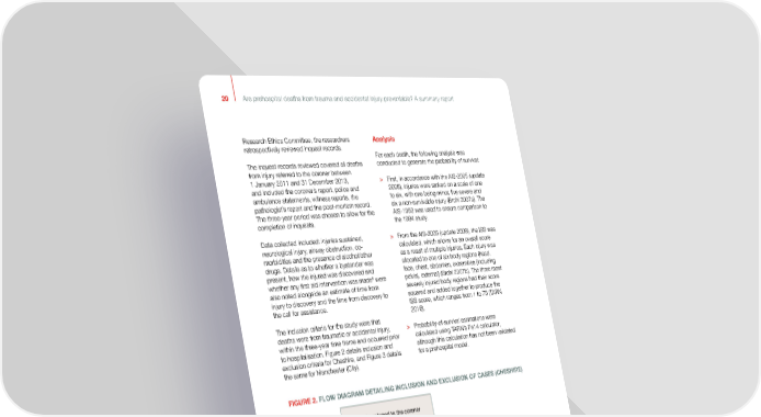 20 Are prehospital deaths from trauma and accidental injury preventable? A summary report Research Ethics Committee, the researchers Analysis retrospectively reviewed inquest records. For each death, the following analysis was The inquest records reviewed covered all deaths conducted to generate the probability of survival: from injury referred to the coroner between 1 January 2011 and 31 December 2013, > First, in accordance with the AIS-2005 (update and included the coroner’s report, police and 2008), injuries were ranked on a scale of one ambulance statements, witness reports, the to six, with one being minor, five severe and pathologist’s report and the post-mortem record. six a non-survivable injury (Brohi 2007a). The The three-year period was chosen to allow for the AIS-1990 was used to ensure comparison to completion of inquests. the 1994 study. Data collected included: injuries sustained, > From the AIS-2005 (update 2008), the ISS was neurological injury, airway obstruction, co- calculated, which allows for an overall score morbidities and the presence of alcohol/other as a result of multiple injuries. Each injury was drugs. Details as to whether a bystander was allocated to one of six body regions (head, present, how the injured was discovered and face, chest, abdomen, extremities (including 6 whether any first aid intervention was made were pelvis), external) (Brohi 2007b). The three most also noted alongside an estimate of time from severely injured body regions had their score injury to discovery and the time from discovery to squared and added together to produce the the call for assistance. ISS score, which ranges from 1 to 75 (TARN 2016). The inclusion criteria for the study were that deaths were from traumatic or accidental injury, > Probability-of-survival estimations were within the three-year time frame and occurred prior calculated using TARN’s Ps14 calculator, to hospitalisation. Figure 2 details inclusion and although this calculation has not been validated exclusion criteria for Cheshire, and Figure 3 details for a prehospital model. the same for Manchester (City). FIGURE 2. FLOW DIAGRAM DETAILING INCLUSION AND EXCLUSION OF CASES (CHESHIRE) Deaths referred to the coroner due to injury: n = 564 Deaths excluded: n = 401 Hospital death: n = 243 Death occurred overseas: n = 19 Prehospital deaths: n = 163 Death due to hanging: n = 139 Further deaths excluded: n = 29 End-of-life care: n = 12 Deaths meeting inclusion Medical or natural cause of death: n = 16 criteria: n = 134 Records not located: n = 1 6 The call for assistance was not classified as a first aid intervention.