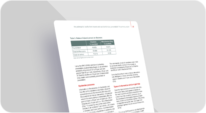 Are prehospital deaths from trauma and accidental injury preventable? A summary report 27 Table 2. Status of injured person on discovery Cheshire Manchester (City) % (number) % (number) Found dead 46 (62) 48 (21) Dead at the scene 43 (58) 34 (15) Dead on arrival 10 (14) 18 (8) Note: Some figures are rounded down Using the WHO (2008) definition of potentially The vast majority of calls for assistance were made preventable or preventable (based on an estimated by someone directly involved in the incident, a probability of survival of 25 to 50 per cent and bystander or a passer-by (93 per cent in Cheshire greater than 50 per cent, respectively), 45 per cent and 86 per cent in Manchester (City)). of Cheshire deaths and 59 per cent of Manchester (City) deaths were potentially preventable or Excluding those found dead, a first aid intervention preventable. was attempted in 43 per cent of the remaining cases in Cheshire and 57 per cent in Manchester Bystander presence (City). Information on the presence of a bystander, and Types of intervention which might help how the call for assistance was made, allows for speculation around the moments after injury and Given the high incidence of traumatic brain injury, the possibility for first aid intervention. A bystander the current study places greater emphasis on was on the scene during or immediately after the the need to provide ventilatory intervention when point of injury in 45 per cent of deaths (n = 60) in a head injury has occurred, particularly due to Cheshire and 43 per cent (n = 19) in Manchester the subsequent physiological response to brain 10 (City). A passer-by was on the scene within injury, known as impact brain apnoea. If the airway minutes in an additional 7 per cent (n = 9) of cases is supported during this time, then death from in Cheshire and 5 per cent (n = 4) in Manchester prolonged apnoea may be avoided (Wilson et al. (City). Furthermore, a bystander or passer-by was 2016). on the scene prior to the emergency services in 96 per cent of Cheshire deaths and 86 per cent of Oliver et al. (2016) go on to note that traumatic Manchester (City) deaths. brain injury is the commonest mode of death following traumatic injury and that the critical In Cheshire, the mean average time taken for the phase of a head injury takes place in the first emergency services to arrive after call-out was 10 minutes, although they also note that this is an 11 8.4 minutes (median 6.5 minutes). In Manchester arbitrary time reference (Atkinson 2000). (City) the average time was 8.1 minutes (median 7 minutes).12 10 The time from injury to discovery is a subjective assessment of the time from the point of injury to someone being on the scene, based on the available evidence. 11 Based on data from 50 records. 12 Based on data from 36 records.