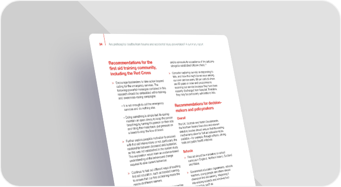 34 Are prehospital deaths from trauma and accidental injury preventable? A summary report Recommendations for the and to advocate for acceptance of the outcome 13 first aid training community, alongside established Utstein criteria. including the Red Cross > Consider exploring our role in responding to falls, and how this might be an issue among > Encourage bystanders to take action beyond our own service users, 89 per cent of whom calling for the emergency services. The are 65 years or older and predominantly following powerful messages contained in this receiving our service because they have been research should be embedded within training recently discharged from hospital. Therefore, and awareness-raising campaigns: they may be particularly vulnerable to falls. – It is not enough to call the emergency services and do nothing else. Recommendations for decision- – Doing something is simple but life-saving: makers and policymakers maintain an open airway to keep the person Overall breathing by turning the person on their side and tilting their head back; put pressure on The UK, Scottish and Welsh Governments, a bleed to stop the flow of blood. the Northern Ireland Executive and relevant statutory bodies should ensure that the existing > Further explore people’s motivation to proceed mechanisms allow for first aid education to be with first aid interventions or not, particularly the available – for example, through schools, driving relationship between deceased and bystander, tests and public health initiatives. as this was not established in the current study. This exploration would form an evidence-based Schools understanding of the behavioural change required to alter current behaviour. > First aid should be mandatory on school curricula in England, Northern Ireland, Scotland > Continue to test out different ways of teaching and Wales. first aid education, such as blended learning, to ensure that our first aid training meets the > Government education departments, schools, needs of different learners. teachers, young people and others should champion first aid learning, integrating it > Continue to use our knowledge and expertise into existing subjects and whole-school to identify areas with a high prevalence of approaches, such as single, older households, and prioritise those communities for first aid education in order to – Physical Education and PSHE education boost community resilience, and potentially (England) prevent death and improve outcomes should community members be present to help. – Health and Well-being (Scotland) > Consider examining the role of the call handler – PSE (Wales) in supporting the bystander to perform first aid. – PDMU and Learning for Life and Work Recommendations for the Red (Northern Ireland) Cross – during assemblies, tutor time or extended learning time. > Seek to lead, along with academic colleagues, the prehospital research community to reach > The Welsh Government should integrate first consensus on what is considered ‘preventable’ aid learning into planned changes to the Welsh in the prehospital therapeutic vacuum. Given the curriculum, due to be implemented in 2018 reputation of the Red Cross within the national and obligatory for schools by 2021. and international first aid community, we are in an excellent position to draw on our substantial networks to help create space for this debate 13 This refers to a uniformed way of collecting data.