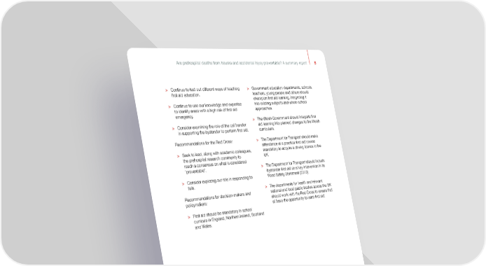 Are prehospital deaths from trauma and accidental injury preventable? A summary report 5 > Continue to test out different ways of teaching > Government education departments, schools, first aid education. teachers, young people and others should champion first aid learning, integrating it > Continue to use our knowledge and expertise into existing subjects and whole-school to identify areas with a high risk of first aid approaches. emergency. > The Welsh Government should integrate first > Consider examining the role of the call handler aid learning into planned changes to the Welsh in supporting the bystander to perform first aid. curriculum. Recommendations for the Red Cross: > The Department for Transport should make attendance at a practical first aid course > Seek to lead, along with academic colleagues, mandatory to acquire a driving licence in the the prehospital research community to UK. reach a consensus on what is considered ‘preventable’. > The Department for Transport should include bystander first aid as a key intervention in its > Consider exploring our role in responding to Road Safety Statement (2015). falls. > The departments for health and relevant Recommendations for decision-makers and national and local public bodies across the UK policymakers: should work with the Red Cross to ensure that all have the opportunity to learn first aid. > First aid should be mandatory in school curricula in England, Northern Ireland, Scotland and Wales.