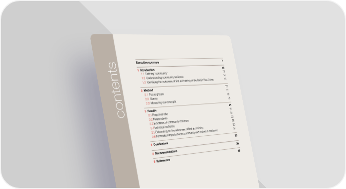 Assessing the links between first aid training and community resilience 5 executive summary 7 1 introduction 13 1.1 Defining ‘community’ 13 1.2 Understanding community resilience 14 1.3 Identifying the outcomes of first aid training at the British Red Cross 15 2 method 17 2.1 Focus groups 17 2.2 Survey 18 2.3 Measuring our concepts 18 contents 3 results 21 3.1 Response rate 21 3.2 Respondents 21 3.3 Indicators of community resilience 22 3.4 Individual resilience 28 3.5 Elaborating on the outcomes of first aid training 30 3.6 Interrelationships between community and individual resilience 31 4 conclusions 35 5 recommendations 39 6 references 43