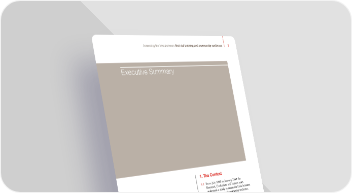 Assessing the links between first aid training and community resilience 7 Executive Summary 1. the context 1.1 From July 2010 to January 2011 the Research, Evaluation and Impact team undertook a study to assess the links between first aid training and community resilience. 1. 2 As a starting point, we defined three primary concepts or features of concepts used in this study – community, community resilience, and first aid outcomes. 1.3 Focus groups and a survey were the primary tools used for data collection. The survey was administered to both a control as well as an intervention (experimental) group. 1.4 Five main indicators of community resilience were identified as: > Social connectedness – feel part of the community, people in the community know the respondent, watch out for each other, and are willing to help each other. > Community efficacy – people in the community are willing to provide first aid to each other, can be relied upon to provide first aid, and are likely to take action in a scenario in which no emergency services are available.