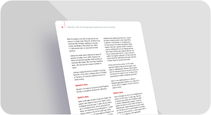 44 Can’t Stay. Can’t Go. Refused asylum seekers who cannot be returned that this evidence was not enough and did not completed and signed application form, photos amount to a fresh claim. Recently, the Red Cross and travel tickets provided by the Home Office. contacted the Ethiopian embassy to request In addition, in the absence of documentation, written confirmation that Joshua had visited he must provide two witness declarations from it. Eight months later, no response has been Algerian nationals, registered at the consulate in received. London, testifying that he is an Algerian national. Samir does not know any Algerian nationals, so it Joshua has made several attempts to apply for has not been possible for him to find a witness to assisted voluntary return (AVR). However, his confirm his Algerian nationality. The Red Cross has return has not been possible. Most recently, he tried to assist him with finding witnesses, but none contacted the Home Office Voluntary Departure of these enquiries has been successful. team, who say they are trying to facilitate his return. On the advice of his solicitor, in 2015, Samir submitted further evidence for his asylum claim Joshua is desperate to find a solution to his long- based on statelessness. However, this evidence term life in limbo and is willing to return to Ethiopia was not considered since he was told that he had or Tanzania. He currently cannot be returned to not followed the correct format. He should have either country. been advised to make a Stateless application. Qareen’s story Samir is now seeking advice on making a Stateless application, but there is no legal aid to Qareen is 44 years old and comes from Palestine. do this. Samir is trapped in the UK and simply He has no documents to prove his nationality. wants to leave. Samir’s story Violet’s story Samir is 36 years old and comes from Algeria. His Violet is 49 years old; she is from Zimbabwe and parents died when he was a child. Samir moved came to the UK nearly 13 years ago. She has to Belgium when he was 14 years old and ended no identity documents and is therefore unable up in a children’s home. He ran away from the to obtain a Zimbabwean passport. Violet has home, but continued living in Belgium for 17 years applied for leave to remain in the UK based on before coming to the UK five years ago. Samir statelessness, despite having no access to legal has no passport or ID from Algeria or Belgium. For aid. Her family had to scrape together the money over three years, Samir has been trying to leave to help her fund a solicitor in order to apply. She is the UK. He applied for AVR twice. Both of these awaiting the outcome of this application. applications expired since he was unable to get a travel document from the Algerian consulate within Zareb’s story the three-month validity of the application. The Home Office refused to grant him an extension of Zareb is 29 years old and was born in Darfur, time to do this. Sudan. He came to the UK with his birth certificate and both of his parents’ passports. However, Samir has been to the Algerian consulate five these documents have been confiscated by times to try to apply for a travel document to the Home Office as they are believed to be return to Algeria. Samir has completed the travel counterfeit. The embassy does not believe Zareb document application and, on one occasion, to originate from Sudan. Zareb is now without his the Red Cross arranged for a volunteer from documents, so he cannot take them to an expert a local organisation to accompany him. She for independent verification. He cannot establish provided photos and a written statement of the his nationality with the Sudanese embassy or even visit. However, the Algerian consulate will still not begin enquiries to obtain a travel document to cooperate because Samir has no ID. They advised allow him to return home. that he should return to the consulate with a