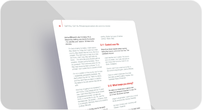 26 Can’t Stay. Can’t Go. Refused asylum seekers who cannot be returned Joshua (Ethiopia) is also homeless. He is coming. Maybe I get paper, Christmas desperately seeking a solution for his situation coming”. (Kasim, Iraq) – he used the word ‘solution’ 38 times in his interview. 3.11 Control over life I’m tired of being homeless. I claim asylum; they refuse me. If they don’t want me in their Most of our refused asylum seekers reported country, they should take me home, find me a feeling they have no control over their lives. Their solution. They don’t want to help me or take comments included: me home. I can’t stay; they can’t take me home…. I’m still in the same situation with no I don’t feel like I am in control. The future is solutions. Solution just be homeless. This is not in my hands. I don’t plan, because you my graveyard. This is not even prison for me; don’t know what tomorrow holds for you. they treat me worse than a prisoner. I’m no (Violet, Zimbabwe) criminal. I don’t come here to commit criminal. Control, I don’t have control over my life, no. I’m not a resident of this country, but I’m here My control is long time gone. (Joshua, Ethiopia) – residentially permanently homeless. Yes, that’s where they left me. That’s my status, I have no control. [Interviewer: How does and they don’t have no reason or solution. that make you feel?] Useless. Helpless. Very Homeless is the only solution they left me frustrated. (Kayla, Zimbabwe) with. How long I’m going to be homeless? I 3.12 What keeps you strong? don’t know, if they already left me 12 years now. I don’t think they’ll find me an answer, We asked our refused asylum seekers what straightforward answer: we take you keeps them strong and helps them to cope. For home, or we do this for you. No. Just the six of them, the answer was hope: homelessness. No solution…. Answers, there is no answers. Solutions, there is no solutions. I hope it will get better. I want to live a normal (Joshua, Ethiopia) life like everyone else. (Qareen, Palestine) Kasim (Iraq) feels that the time he has spent My hope. Of doing well, of surviving well. waiting in the UK – unable to study or work – is (Faheem, Palestine) worse than being sent back to Iraq and possible death. He feels that, at least, would be mercifully Three participants reported that their faith keeps swift compared to the eight long years spent in them strong: limbo that have ground him down: I don’t know. God. God maybe keeps Every day I’m dying…. Every day. Every day me going, because Home Office have no you are scared, you’re thinking about yourself... conclusion or decision to resolve this problem. you don’t have support, tomorrow what will (Joshua, Ethiopia) happen. It’s very difficult. (Kasim, Iraq) Fiyori (Eritrea) and Enaya (Palestine) both said Kasim feels that, after eight years of waiting, he is that they stay strong for their children: getting too old to move on with his life: I have to be strong for my daughter. My When first time I’m coming I’m young…. But daughter keeps me going. (Enaya, Palestine) if now, now you give me paper, how I go be student. My head, my brain, too much get Violet (Zimbabwe) and Kasim (Iraq), both active tired. (Kasim, Iraq) volunteers, reported that keeping busy helps them to cope: Kasim still has hope and, every year at Christmas, wonders if he will receive some good news: The main way I cope is by keeping busy…. I try and do as much volunteering as possible. I Still I wait here…. Yeah, always, every year, volunteer at the Red Cross three days a week when Christmas coming, I say, “Oh, this and two days a week at the Salvation Army…. one, maybe it’s coming; definitely this news I want to help people like me – asylum