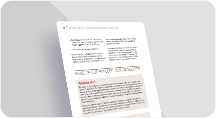 12 Can’t Stay. Can’t Go. Refused asylum seekers who cannot be returned > Semi-structured interviews with refused asylum was not meant as a legal analysis or fact-checking seekers who cannot be returned and Red Cross exercise. The amount of information available for refugee support staff who work with them. each individual varied. > An interview with a legal professional. Some of our refused asylum seekers are disputed nationality cases. Where the country of origin is We also asked our refused asylum seekers for noted for our refused asylum seekers, this is their their permission to review their case records, self-reported country of origin. The names of all where available. This allowed us to gather a more participants have been changed and none of the detailed understanding of their situations. This photos in the report are of actual participants. SOME OF OUR REFUSED ASYLUM SEEKERS Faheem’s story Faheem is 44 years old and comes from Palestine. Faheem has been in the UK for nine years and has no ID documents. The Palestinian mission has no record of him and refuses to recognise him as a Palestinian. Faheem has applied for assisted voluntary return (AVR) to Palestine three times. However, since he is unable to get a travel document from the Palestinian mission, his first two applications expired. Faheem’s third application was rejected due to lack of documentation. The Home Office stressed it was unacceptable that Faheem had no new evidence to assist AVR in obtaining a travel document for him. Faheem is unable to obtain a Palestinian passport, so he cannot be returned. He is currently gathering evidence to apply for leave to remain as a stateless person. Faheem is without a home and without a country. He says: “I have missed my chance of a proper life; I have no home, I have no partner, I have no job, my age is going up. My situation is miserable.” Kasim’s story Walid’s story Kasim is 29 years old; he does not have an Walid is 44 years old and comes from Iraqi passport or other form of ID. The Iraqi Algeria; he has been in the UK for nearly 17 embassy has advised that it cannot assist years. He left Algeria during the war. Walid him with documents. For Kasim to obtain lost his passport a long time ago, before a travel document, he needs to have a arriving in the UK. Walid has applied for laissez-passer, a valid or expired passport, assisted voluntary return (AVR) to Algeria or the family record number in the local civil but, without a travel document, he cannot registration office. The Home Office expect be returned. He has been to the Algerian Kasim to get assistance from his family in Iraq embassy twice to try to get re-documented. and follow procedures that permit a family However, as he has been out of the country member to obtain an ID on his behalf. Kasim for so long, they refuse to recognise him is from Mosul and he has lost contact with as an Algerian national. Walid is stuck in his family; he cannot get their help. He is very no man’s land, and has suffered two heart worried about his family and is desperate to attacks since he has been in the UK. He is be in touch with his mother. Kasim has tried seeking advice on whether he can apply tracing his family through the Red Cross, for leave to remain as a stateless person. but was told the situation in Mosul is too However, Walid does not see this as a good dangerous for International Committee of the solution; he sees it as a very last resort. Red Cross (ICRC) presence.