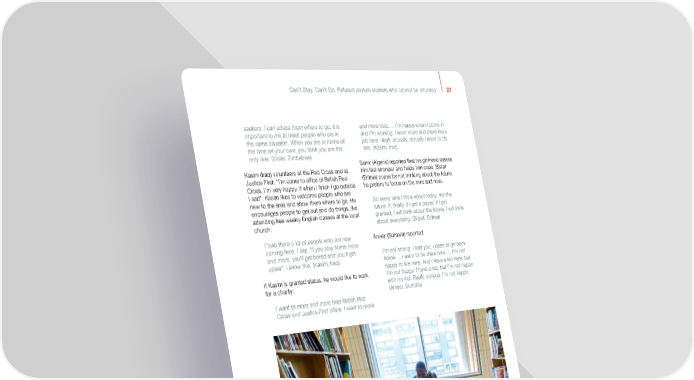Can’t Stay. Can’t Go. Refused asylum seekers who cannot be returned 27 seekers. I can advise them where to go. It is and more help…. I’m happy when I come in important to me to meet people who are in and I’m working. I want more and more have the same situation. When you are at home all job here. Yeah, actually, actually I want to do the time on your own, you think you are the this. (Kasim, Iraq) only one. (Violet, Zimbabwe) Samir (Algeria) reported that his girlfriend makes Kasim (Iraq) volunteers at the Red Cross and at him feel stronger and helps him cope. Bisrat Justice First: “I’m come to office of British Red (Eritrea) copes by not thinking about the future; Cross, I’m very happy. If when I finish I go outside he prefers to focus on the here and now: I sad”. Kasim likes to welcome people who are new to the area and show them where to go. He So every time I think about today, not the encourages people to get out and do things, like future. If, finally, if I get a paper, if I get attending free weekly English classes at the local granted, I will think about the future, I will think church: about everything. (Bisrat, Eritrea) I take there a lot of people who are new Anwar (Somalia) reported: coming here. I say, “If you stay home more and more, you’ll get bored and you’ll get I’m not strong. I told you, I need to go back upset”. I know this. (Kasim, Iraq) home…. I want to be there now…. I’m not happy to live here. And I have a kid here, but If Kasim is granted status, he would like to work I’m not happy. I have a kid, but I’m not happy for a charity: with my kid. Really, serious, I’m not happy. (Anwar, Somalia) I want to more and more help British Red Cross and Justice First office. I want to more