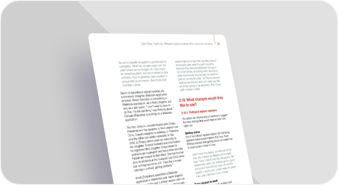 Can’t Stay. Can’t Go. Refused asylum seekers who cannot be returned 31 So we’ve actually struggled to get that kind of people that we’ve seen like that, they haven’t assistance. When we’ve seen cases over the necessarily seen what the point would be years where we’ve thought, oh, there might because they have possibly been through a be something there, and we’ve talked to local lot of this before, accessing other services in solicitors, they’ve generally been unwilling to other towns even, they’ve been somewhere pursue that as an avenue. (Red Cross staff prior to coming to Leeds. So they’ve become member, Leeds) disillusioned anyway and can’t really see that anything’s going to go anywhere. (Red Cross Seven of our refused asylum seekers are staff member, Leeds) somewhere along the Stateless application process. Anwar (Somalia) is considering a Stateless application, as is Walid (Algeria), but 3.16 What changes would they only as a last resort: “I don’t want to have to like to see? do that. It’s the last thing I was thinking about.” Faheem (Palestine) is working on a Stateless 3.16.1 Refused asylum seekers application. We asked our refused asylum seekers to suggest The Red Cross in Leicester helped send Enaya the main change that would improve their lives (Palestine) and her daughter to the Liverpool Law right now. Clinic. Enaya’s daughter is stateless. In Palestine, only the father can confer nationality on the Getting status child, so Enaya cannot pass her nationality to Six of our refused asylum seekers felt that being her daughter. Enaya’s husband was killed before granted status would improve their lives. Fiyori he registered their daughter. Enaya herself is (Eritrea) believes that getting status will enable her unable to get a passport and has a letter from the to improve her children’s lives: Palestinian mission to that effect. She has told her story to students at the Liverpool Law Clinic twice, I don’t have the papers, so I feel sad all the but nothing has come of it: “I feel like a mouse time. My children are illegals and that feels running in a wheel; getting nowhere.” bad. I have a friend who has the papers. Her children live nicely; her children go to a good Violet (Zimbabwe) submitted a Stateless school and have all they need. If I had the application in March this year. Samir (Algeria) papers, I could work. I could make life better. and his solicitor put in a fresh asylum claim on Every day I feel sad. (Fiyori, Eritrea) the basis of statelessness. The evidence was acknowledged, but the refusal made it clear Being allowed to work that this was the wrong form for making such Four of our refused asylum seekers said an application. Samir will have to make a new specifically that being allowed to work is the application on the correct form if he wants to change they want most: move forward. Being able to work. To have a normal life like Kayla (Zimbabwe) and Joshua (Ethiopia) have had everyone else. To work. To live. I don’t want their Stateless applications refused. money from the Home Office; I don’t want benefits. I want to work. I want to have a family The Leeds staff member reported that refused and a house. I don’t want to just sit here. I asylum seekers become so disillusioned that it is need to be normal. I don’t want to be like difficult to convince them there are options: this – no money, no house, no food. (Qareen, Palestine) I mean, there’s people that we’ve worked with who could potentially have been looking at I was asking the Home Office to just give me statelessness applications that we just can’t permission to work. If they don’t want to give even get past the point of trying to get their me permission to stay, just give me permission documents back from the Home Office…. to work. I go to work. Not like now. I cannot Some of them you can’t even get past the work; I cannot do anything…. If you cannot first hurdle and then they don’t…. Because give me permission to stay, just give me they’re street homeless and they’ve got mental permission to work until I find some solution…. health issues, just trying to get them in to If you give me permission for work, I’m going to access the service to try and work on those work. I pay my rent, I pay for everything. (Samir, things is impossible. For them, some of these Algeria)