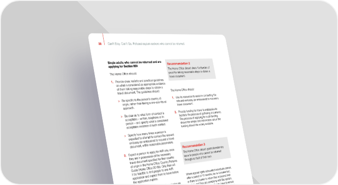 38 Can’t Stay. Can’t Go. Refused asylum seekers who cannot be returned Single adults who cannot be returned and are Recommendation 2 applying for Section 95A The Home Office should share the burden of The Home Office should: proof for taking reasonable steps to obtain a travel document. 1. Provide clear, realistic and practical guidelines on what is considered as appropriate evidence of them taking reasonable steps to obtain a travel document. The guidelines should: The Home Office should: > Be specific to the person’s country of 1. Use its resources to assist in contacting the origin, rather than taking a one-size-fits-all relevant embassy (or embassies) to request a approach. travel document. > Be clear as to what form of contact is 2. Provide funding for travel to embassies to acceptable – written, telephone or in- facilitate the process of gathering documents. person – and specify what is considered The process of applying for such funding acceptable evidence of such contact. should be simple and information about the funding should be widely available. > Specify how many times a person is expected to attempt to contact the relevant embassy (or embassies) to request a travel document, within reasonable parameters. 2. Expect a person to apply for AVR only once Recommendation 3 they are in possession of the necessary The Home Office should grant discretionary travel document specified for their country leave to people who cannot be returned of origin in the Home Office Country Returns through no fault of their own. Guide (Home Office 2016b). Only then will it be feasible to limit people to one AVR application and expect them to leave before the application expires. Where appeal rights exhausted individuals cannot, after a period of 12 months, be re-documented, 3. Suspend the policy of regularly reviewing an or there is a barrier to return that is beyond their individual’s support when there is evidence control, and they are complying with the system, that the person has done everything in their they should be given discretionary leave to remain power to comply with re-documentation with a right to work and access higher education in procedures. the UK. 4. Re-instate the right of appeal for those who Putting in place temporary status for this are refused Section 95A support. group will prevent destitution. 5. Allow people who cannot be returned to apply for Section 95A at any time, removing the restriction of only being able to apply within the 21-day grace period. 6. Take measures to ensure people who cannot be returned do not fall through the safety net when making the transition from Section 95 to Section 95A. Keeping this group on support will prevent destitution and protect them from potential exploitation.