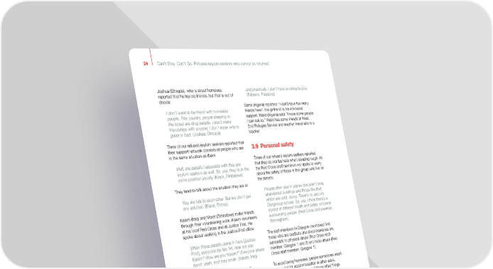 24 Can’t Stay. Can’t Go. Refused asylum seekers who cannot be returned Joshua (Ethiopia), who is street homeless, and practically. I don’t have anything to give. reported that he has no friends, but that is out of (Faheem, Palestine) choice: Samir (Algeria) reported: “I don’t have too many I don’t want to be friend with homeless friends here”. His girlfriend is his emotional people. This country, people sleeping in support. Walid (Algeria) said: “I have some people the street are drug people. I don’t make I can talk to.” Walid has some friends at West friendships with anyone; I don’t know who is End Refugee Service and another friend who is a good or bad. (Joshua, Ethiopia) teacher. Three of our refused asylum seekers reported that their support network consists of people who are 3.9 Personal safety in the same situation as them: Three of our refused asylum seekers reported Well, the people I associate with they are that they do not feel safe when sleeping rough. All asylum seekers as well. So, yes, they’re in the the Red Cross staff members we spoke to worry same position usually. (Kayla, Zimbabwe) about the safety of those in this group who live on the streets: They tend to talk about the situation they are in: People often stay in places that aren’t safe, Yes, we talk to each other. But we don’t get abandoned buildings and things like that, any solution. (Bisrat, Eritrea) which are cold, damp. There’s no security. Dangerous access. So, yes, I think there’s a Kasim (Iraq) and Violet (Zimbabwe) make friends myriad of different health and safety concerns through their volunteering work. Kasim volunteers surrounding people. (Red Cross staff member, at his local Red Cross and at Justice First. He Birmingham) spoke about working in the Justice First office: The staff members in Glasgow mentioned that When these people come in here [Justice those who are destitute and street homeless are First], everyone be like “Hi, how are you vulnerable to physical abuse (Red Cross staff Kasim? How are you Kasim?” Everyone shake member, Glasgow 1 and 2) and racial abuse (Red hand, yeah, and they smile. (Kasim, Iraq) Cross staff member, Glasgow 1). Besides the friends she makes through To avoid being homeless, people sometimes resort volunteering at the Leicester Red Cross and the to “paying for accommodation in other ways, Salvation Army, Violet (Zimbabwe) is involved which can include sex and all these other things in the Zimbabwe Association, an independent, that sound like domestic servitude” (Red Cross charitable organisation that works with asylum staff member, Glasgow 1). One of the Glasgow seekers in the UK. They meet fortnightly and Red Cross staff members worries particularly talk about the current situation in Zimbabwe about her female clients. Some of them have and in the UK. “We socialise, eat, talk” (Violet, resorted to prostitution and have ended up in A&E Zimbabwe). Violet is also involved in the “beaten and abused” (Red Cross staff member, Restoration of Human Rights Zimbabwe group, Glasgow 2): which meets monthly. It’s just because these people are desperate Enaya (Palestine) and Faheem (Palestine) both find to make some money. I think it’s that thing it difficult to talk to other people: of, eventually, people get tired of helping you. And eventually you become a burden to them. I know a few people, but I am not telling them Yes, I think there is a risk of exploitation. I think like how I feel. (Faheem, Palestine) it’s worse, obviously, for female clients…. I think the understanding is that a female client Faheem (Palestine) also feels he has nothing to is more at risk of prostitution, exploitation bring to a friendship: through that. If she’s street homeless or she’s having to rely on people, there’s a chance I don’t want a lot of friends. I’m homeless. she might get into a bad relationship or People want something from you mentally become dependent on someone – or, through