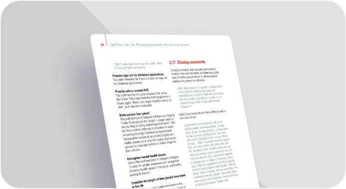 34 Can’t Stay. Can’t Go. Refused asylum seekers who cannot be returned I don’t really see it come up very often. (Red 3.17 Closing comments Cross staff member, Leeds) Closing comments from our participants related Provide legal aid for Stateless applications mostly to the need for better understanding of the Two staff members felt there is a need for legal aid level of suffering experienced by refused asylum for Stateless applications. seekers who cannot be returned. Provide advice around AVR I think there should be a greater understanding The staff member in Leeds stressed that, since of the levels of suffering that people do the Home Office has taken the AVR programme in experience as a result of destitution, and taking house again, there is no longer impartial advice on that into account and what is humane to put AVR. Such advice is invaluable. people through. (Red Cross staff member, Glasgow 1) Make people feel valued The staff member in Teesside felt there is a need to Kasim (Iraq) would like the Home Office to walk a “make these people feel valued – people want to mile in his shoes: feel like they’re doing something worthwhile”. She felt this could be achieved in a number of ways, If government come and stay with some including providing volunteering opportunities, asylum seeker, homeless people, no have having better access to structured English and food, no eat, no have clothes, no have place maths classes on a long-term basis, and having for live, no have anything, live in the street. access to a sewing machine to make things for After, he’d understand how it is very difficult their children. for you…. After, he understand what happen. But, you know, Home Office have this nice Recognise mental health issues life. He sleep in that condition, have nice car, One of the staff members in Glasgow (Glasgow have nice money – he no care about me. But 1) called for greater awareness and recognition if he one day, two day, come to feel sleeping of mental health issues in this group, particularly in outside park, or sleep in the street, and no relating to trauma. food. After he understand how this is hard life. And if he sees people in this situation, without Consider the length of time people have been family, without country, without everything; if he in the UK understand this life, people, why people leave A number of our participants have been in the their country and come here, then he will have UK for more than ten years. The staff member in to think about people. (Kasim, Iraq) Leicester felt this needs to be considered: Walid (Algeria) concluded: If you have come here ten years ago, it’s not really reasonable for them to be removed and I don’t want to be rich, big money, nice house, sent back to a country where maybe they’ve nice life. No, I don’t want to be rich or nice life. not spent loads of time, and they’ve got no I need just a normal life. (Walid, Algeria) connection there. (Red Cross staff member, Leicester)