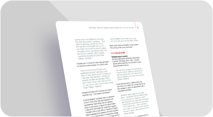 Can’t Stay. Can’t Go. Refused asylum seekers who cannot be returned 21 A group of five or six Englishman were there. accommodation]. Yes, it’s cold; it’s very cold They don’t like my look or something…. They now. I was sick; it was very bad. (Bisrat, Eritrea) called me black dog. Just like that. One of them tap me on the shoulder and, as I turn, Bisrat worries about surviving the cold this winter: one of them hits me with the stick of baseball. “The coming winter is very bad for me.” I fell straight down; I can’t defend myself. They beat me up so well that I didn’t recognise 3.7.2 Mental health myself when the police bring the picture. (Faheem, Palestine) Refused asylum seekers We asked participants about their mental health Faheem was in a coma for a few days and when in general. Worryingly, seven of the 15 refused he recovered consciousness, he couldn’t walk: asylum seekers said they had considered suicide. Qareen (Palestine) told us: I can’t control my body. My brain is not speaking to my body. It took ages, a few I am sad. Life is not good. I am not living life…. years, to heal. Couldn’t go out. I survived, but I have no control. I wanted to commit suicide. I was really, really destroyed – mentally and My friend stopped me. I don’t know what is physically. My brain was damaged. When I going to happen to me. I have very low moods. was in court in Dover, when I saw the CCTV, (Qareen, Palestine) oh man, oh man. I don’t want to think of these things. (Faheem, Palestine) Anwar (Somalia) feels it might be better if he dies. After a lot of effort, the Leicester Red Cross Faheem still battles with dizziness and cannot has managed to secure an appointment with a stand for long: “I lose balance sometimes.” consultant psychiatrist. Violet (Zimbabwe) was being held in a detention Sometime I feel it’s better for me to pass centre in 2008 when she was diagnosed with away…. Sometimes I think that God he forget hypertension. Kasim (Iraq) has had epilepsy me, but God, he don’t forget me – still I’m since he was young. Living on the street makes alive. But still I’m not happy to live. Sometimes it difficult for him to take his medication regularly. I hope that God does make me to pass away. “Sometime this is very difficult. Sometime I forget”. I’m not happy to live…. Soon I will lose my Kasim’s epilepsy has worsened since he has been mind, really. I’m not crazy. I’m not crazy, but in the UK and he has had to increase the dosage the way I’m going, I think I will lose my mind. of his medication. Life on the street is hard and he (Anwar, Somalia) worries about his family back home, particularly his mother. Aman (Iraq) has terrible nightmares and has considered suicide: Walid (Algeria) has had two heart attacks since he has been in the UK. He will be on medication for I have very bad sleeping. When I’m sleeping I life. He is currently homeless, even though his GP get like flashback, nightmare. I see things bad has written a letter to the Home Office saying that happen to my family…. Sometimes it came someone with his condition should not be living on to me to suicide myself. Yes, since I have not the street. got news about my family, and I can’t – I have no place to live here, that’s affected me a lot. Joshua (Ethiopia) reports generally feeling unwell: (Aman, Iraq) You see me, I’m not healthy. I’m not healthy. Faheem (Palestine) admits he was suicidal when I’m not healthy. I don’t feel strong, or powerful, he first moved to Birmingham after being badly no. I’m getting old. My health is not well…. beaten in Dover: Lack of food; can’t get food. Hard. It’s cold, and nowhere to go. (Joshua, Ethiopia) Sometimes I wanted to jump from the bridge in front of the train. I was damaged. I was Bisrat (Eritrea) lost his Section 4 accommodation miserable, painful. I didn’t want my life to carry in August 2016. For the first week after that he on like this; I just want it to end. (Faheem, slept on the street and soon became ill: Palestine) About a week, I sleep on the street, when At the time, Faheem was in shared Section 4 the first time I left the house [Section 4 accommodation. He would wake screaming in the
