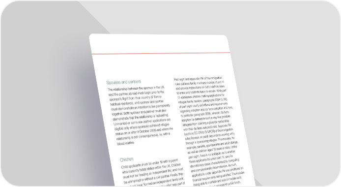 Spouses and partners Part eight and appendix FM of the immigration The relationship between the sponsor in the UK rules address family members outside of part 11 and the partner abroad must begin prior to the and provide instructions on both indefinite leave sponsor’s flight from their country of ‘former to enter and indefinite leave to remain. While part habitual residence’, and sponsor and partner 11 addresses children making applications for must demonstrate an intention to live permanently refugee family reunion, paragraphs 309A to 315 together. Both sponsor and partner must also of part eight clarify definitions and requirements demonstrate that the relationship is ‘subsisting’. regarding adoption and de facto adoption. It is here, Unmarried or same-sex partner applications are in particular paragraph 309A, wherein ‘de facto eligible only where sponsors achieved refugee adoption’ is defined in such a way that prohibits status on or after 9 October 2006 and where the refugees from claiming a parental relationship relationship is not consanguineous, i.e. with a with their de facto adopted child. Appendix FM blood relative. (sections EC-DR to D-ILRDR) of the immigration rules focuses on adult dependants seeking entry through a sponsoring refugee. This includes, for example, parents, grandparents and adult siblings, Children as well as children aged 18 years or older. Unlike Child applicants must be under 18 with a parent part eight, there is no ambiguity as to whether who currently holds status within the UK. Children these applicants fall under part 11, save for must not be ‘leading an independent life’, and must discretionary cases characterised by compelling be unmarried or without a civil partner. Finally, they and compassionate circumstances. As such, must not have ‘formed an independent family unit’. applications under appendix FM are conditional on Other conditions include that the child ‘was part of financial requirements being satisfied. This includes the family unit of the person granted asylum at the being able to maintain and accommodate such time that the person granted asylum left the country dependants without recourse to public funds. of his habitual residence in order to seek asylum’. There are no qualifications on stepchildren or How the British Red Cross helps adopted children within part 11. However, SET10 refugee families guidance, used by entry clearance officers for cases brought forward under part 11, outlines The British Red Cross helped 41 refugees parameters for adopted and de facto adopted obtain visas for 100 family members in 2015. children. Furthermore, the Home Office’s Statement of Intent: Family Migration holds that refugees and Our travel assistance programme helped 383 persons with humanitarian protection ‘will be able, refugees reunite with family members in exceptional circumstances, to sponsor a child 1,187 relative, e.g. the child of a dead or displaced brother in the same year. or sister, and without having to meet the income threshold’ (Home Office 2012, 33). 7