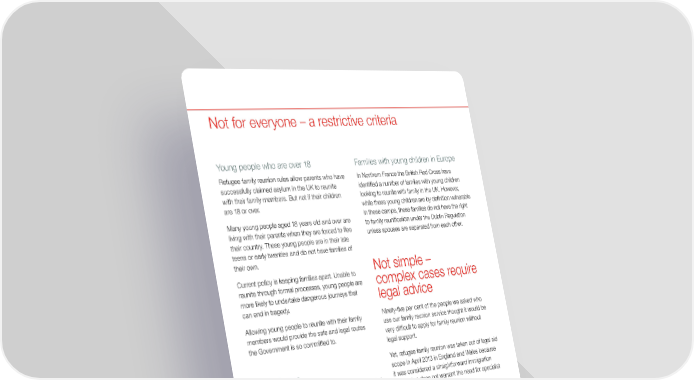 Not for everyone – a restrictive criteria Young people who are over 18 Families with young children in Europe Refugee family reunion rules allow parents who have In Northern France the British Red Cross have successfully claimed asylum in the UK to reunite identified a number of families with young children with their family members. But not if their children looking to reunite with family in the UK. However, are 18 or over. while these young children are by definition vulnerable in these camps, these families do not have the right Many young people aged 18 years old and over are to family reunification under the Dublin Regulation living with their parents when they are forced to flee unless spouses are separated from each other. their country. These young people are in their late teens or early twenties and do not have families of their own. Not simple – Current policy is keeping families apart. Unable to reunite through formal processes, young people are complex cases require more likely to undertake dangerous journeys that legal advice can end in tragedy. Allowing young people to reunite with their family Ninety-five per cent of the people we asked who members would provide the safe and legal routes use our family reunion service thought it would be the Government is so committed to. very difficult to apply for family reunion without legal support. Yet, refugee family reunion was taken out of legal aid Child refugees scope in April 2013 in England and Wales because There are provisions in place to allow unaccompanied it was considered a straightforward immigration children in the EU with relatives in other member matter that does not warrant the need for specialist states to reunite with extended family members legal support. as well as their parents (under Dublin III). However, Our evidence demonstrates that many refugee unaccompanied children outside the EU can only family reunion cases are complex and often require reunite with their parents and not other close the flexibility, expertise and experience of legal relatives in the UK. advisers to deal with them. As UNICEF have pointed out, ‘these laws fail to recognise that after years of conflict, many of these children have been orphaned – but they may have For example, our report, Not so grandparents, aunts and uncles, or adult brothers straightforward, found: and sisters in the UK who can care for them’. > Thirty-three per cent of 91 refugee family In addition, refugee children within the UK are reunion cases relied on witness statements unable to sponsor their parents living abroad to join and statutory declarations produced by legal them under refugee family reunion. advisers. A quarter featured an interview or documentation discrepancy. 14