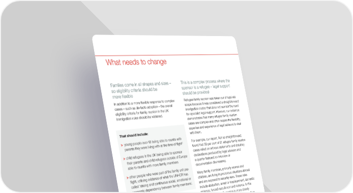 What needs to change Families come in all shapes and sizes – This is a complex process where the so eligibility criteria should be sponsor is a refugee – legal support more flexible should be provided In addition to a more flexible response to complex Refugee family reunion was taken out of legal aid cases – such as de-facto adoption – the overall scope because it was considered a straightforward eligibility criteria for family reunion in the UK immigration matter that does not warrant the need immigration rules should be widened. for specialist legal support. However, our evidence demonstrates that many refugee family reunion cases are complex and often require the flexibility, That should include: expertise and experience of legal advisors to deal with them. > young people over-18 being able to reunite with parents they were living with at the time of flight5 For example, our report, Not so straightforward, found that 33 per cent of 91 refugee family reunion > child refugees in the UK being able to sponsor cases relied on witness statements and statutory their parents and child refugees outside of Europe declarations produced by legal advisors and able to reunite with more family members a quarter featured an interview or documentation discrepancy. > other people who were part of the family unit pre- flight, utilising evidence of what the UNHCR has Many family members, primarily women and called ‘strong and continuous social, emotional or children, are living in precarious situations abroad economic dependency between family members’. and are exposed to security risks. These risks include abduction, arrest or imprisonment, domestic violence, forced recruitment and violence. In this The Dublin III Regulation should be used proactively regard, refugee family reunion is more closely by the UK and other member states to facilitate aligned with asylum, which remains in scope, than family reunion. In addition to speeding up routes to immigration. Faced by these dangers and unable protection for eligible unaccompanied minors and to exercise their rights to family reunion through separated spouses, the discretionary clauses of existing formal processes, family members are more Dublin should be utilised to allow for families with likely to embark on dangerous and illegal routes to young children in camps to reunite with other adult reach the UK. family members. This would speed-up the process of relocation within Europe, which is currently not functioning. Not having the cash should not be a barrier to protection for refugee families 5. When referring to ‘young people’ we mean children up to the age of 25 who were living with their parents at the time they were forced to flee their home country. Both UK legislation and international definitions consider ‘young people’ to include those up to the age of 24-25. This is the definition used for former looked-after children in the Children Act 1989 and the Children and Young Persons Act 2008. Further, the UN also defines ‘youth’ as 15-24-year-olds. 17
