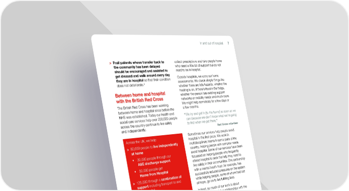In and out of hospital 7 > Frail patients whose transfer back to collect prescriptions and take people home the community has been delayed who need a little bit of support but do not should be encouraged and assisted to need to be in hospital. get dressed and walk around every day Outside hospitals, we carry out home they are in hospital so that their condition assessments. We check simple things like does not deteriorate.5 whether there are falls hazards, whether the Between home and hospital heating is on, if there's food in the fridge, with the British Red Cross whether the person has existing support networks or mobility needs and much more. The British Red Cross has been working We might help somebody for a few days or between home and hospital since before the a few months. NHS was established. Today our health and “ We try and get in [to the home] as soon as we social care services help over 200,000 people can because we don’t know what we’re going across the country continue to live safely to find when we get there.” and independently. Red Cross volunteer Across the UK, we help: Sometimes our services help people avoid hospital in the first place. We work in > 80,000 people to live independently multidisciplinary teams in some parts of the at home country, helping people with complex needs • 30,000 people through our avoid hospital. Some of our services have been A&E discharge support focussed on helping people who frequently • 50,000 people get attend hospital to seek the help they need to Home from Hospital live safely in their communities. One partnership with a mental health trust, for example, has > 125,000 through a combination of successfully reduced pressures on the system support including transport to and while helping people, some of whom had lost from hospital all hope, go on to live fulfilling lives. > 90,000 people with short-term access Indeed, so much of our work is about to mobility aids such as wheelchairs. spending time building relationships with the people using our services. We might learn, Our services have a simple idea at their heart: for example, that somebody won’t leave their preventing health problems from escalating house because they are afraid of falling. In into personal crises. At their best, they this case, something as simple as a ramp enable people to regain their confidence could make all the difference. Sometimes it’s a and independence. wheelchair, or help managing finances so that the heating is not cut off. It is this position, working within both the Again and again we find that by taking the time community and hospitals, which gives us a to get to know people, we learn just how big unique insight into where people are falling small interventions can be. So often, they prove through the gaps. the difference between living independently at Much of our operational work is focused on home and being admitted to a care home getting people home safely from both A&Es or hospital. and hospital wards. We work in hospitals across the country, providing the practical and emotional support others might not have time for. We might sit with disorientated patients, 5 Older people are estimated to lose 5 per cent of muscle strength per day in hospital, ultimately reducing their ability to live independently at home once discharged. National Audit Office Discharging older patients from hospital (May 2016).