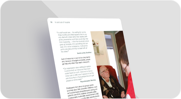 14 In and out of hospital “ In adult social care… the waiting list can be three months and what happens then is you only deal with crises rather than dealing with all the preventative work that would stop that from happening… I think the threshold criteria goes up because, if it's something that can wait, if it's not an emergency, it will just be put to one side until they’ve dealt with all the crises.” Social worker, Bradford Lack of resources is seen to be a key barrier and, because of budget constraints, people get help only when they reach crisis point. “ Our organisation does nothing [in relation to prevention], our resources have been scaled back so much. I think we’ve had so many cuts to staff, now it appears to be the sole focus from a Trust perspective is to get people out of the beds.” Physiotherapist, Warmley Participants from almost all groups spoke positively about falls prevention initiatives, such as hospital-based physiotherapists asking out- patients over 60 to routinely complete a falls questionnaire; routine falls assessments in A&E, exercise classes, proactive falls hazards checks and so on. However, they also noticed falls prevention schemes in the community being cut, most typically due to stretched adult social care budgets.