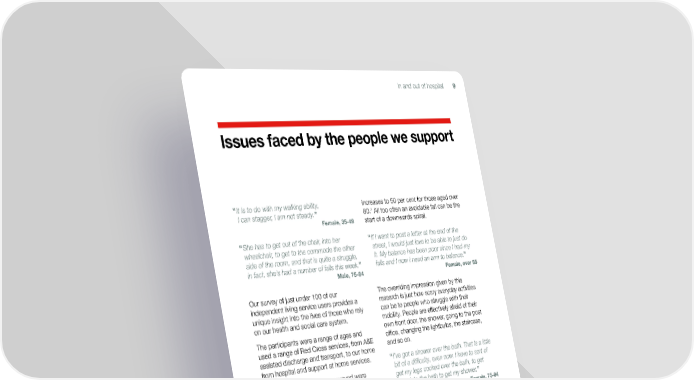In and out of hospital 9 Issues faced by the people we support “ It is to do with my walking ability, increases to 50 per cent for those aged over 7 I can stagger, I am not steady.” 80. All too often an avoidable fall can be the Female, 35-49 start of a downwards spiral. “ She has to get out of the chair, into her “ If I want to post a letter at the end of the wheelchair, to get to the commode the other street, I would just love to be able to just do side of the room, and that is quite a struggle, it. My balance has been poor since I had my in fact, she’s had a number of falls this week.” falls and I now I need an arm to balance.” Male, 75-84 Female, over 85 Our survey of just under 100 of our The overriding impression given by this independent living service users provides a research is just how scary everyday activities unique insight into the lives of those who rely can be to people who struggle with their on our health and social care system. mobility. People are effectively afraid of their The participants were a range of ages and own front door, the shower, going to the post used a range of Red Cross services, from A&E office, changing the lightbulbs, the staircase, assisted discharge and transport, to our home and so on. from hospital and support at home services. “ I’ve got a shower over the bath. That is a little Over 90 per cent of those surveyed were bit of a difficulty, even now. I have to sort of limited by a health problem or disability get my legs cocked over the bath, to get expected to last at least 12 months. The even into the bath to get my shower.” majority were limited by a mobility issue or Female, 75-84 by stamina or breathing difficulty. They also We believe that that there are usually relatively often had more than one long-term issue and simple solutions to these well-founded fears: 38 per cent had three or more conditions. the provision of mobility aids, exercise classes Feeling unsafe to build up strength, checking for falls hazards at home. It’s estimated that addressing falls Over half the people we spoke to did not feel hazards in the home could save the NHS in England £435m a year.8 completely safe in their own home. People who are ‘limited a lot’ by a long-term health disability were, perhaps unsurprisingly, more likely to say Struggling with everyday tasks they feel less safe in and outside their home. On average, our service users reported having The most common reason people felt unsafe difficulty with seven out of 15 everyday tasks: was around falling outside the home (68 per ranging from doing work around the house, cent) and inside the home (57 per cent). These getting dressed, managing finances and fears are not unfounded: 30 per cent of people washing to preparing a hot meal. aged over 65 will fall at least once a year; this 7 Public Health England. 8 Public Health England Falls and fracture consensus statement Supporting commissioning for prevention (January 2017).