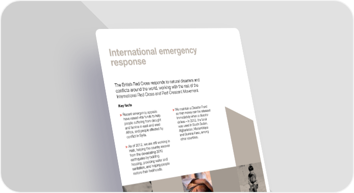 Photos on opposite page: © Olav Saltbones, © Ibrahim Malla/Syrian Red Cr International emergency response The British Red Cross responds to natural disasters and conflicts around the world, working with the rest of the International Red Cross and Red Crescent Movement. Key facts escent, © M. Al-Zuabi/ICRC. Photo on this page: © Sarah Oughton/BRC. > Recent emergency appeals > We maintain a Disaster Fund have raised vital funds to help so that money can be released people suffering from drought immediately when a disaster and famine in east and west strikes – in 2012, the fund Africa, and people affected by was used in South Sudan, conflict in Syria. Afghanistan, Mozambique and Burkina Faso, among > As of 2012, we are still working in other countries. Haiti, helping the country recover from the devastating 2010 earthquake by building housing, providing water and sanitation, and helping people restore their livelihoods. Ouilimatou is 21 months old. He lives in the Sahel region of Burkina Faso, where lack of rain, drought and insect infestation led to poor harvests in 2012. His mother got sick and gave him to his grandmother Fatima to look after. Fatima brought Ouilimatou to the Red Cross health post in her remote village, where volunteers gave him a vitamin and mineral-enhanced porridge to help improve his health and referred him to the nearest health centre for more intensive treatment. Many women in the Hers is one of 23 villages in the region with a Red Cross health post village now want to join to treat malnourished children. the group as they see how Our West Africa Food Crisis Appeal funded food supplies and much it profits us healthcare across the region, as well as helping improve immigration and farming techniques to minimise the impact of future droughts. Oroukia, who works in a community redcross.org.uk/currentemergencies garden in Burkina Faso