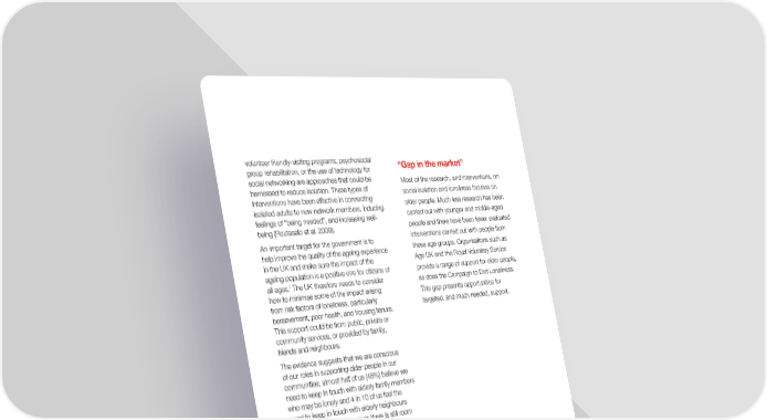 volunteer friendly-visiting programs, psychosocial “Gap in the market” group rehabilitation, or the use of technology for social networking are approaches that could be Most of the research, and interventions, on harnessed to reduce isolation. These types of social isolation and loneliness focuses on interventions have been effective in connecting older people. Much less research has been isolated adults to new network members, inducing carried out with younger and middle-aged feelings of “being needed”, and increasing well- being (Routasalo et al. 2009). people and there have been fewer evaluated An important target for the government is to interventions carried out with people from help improve the quality of the ageing experience these age groups. Organisations such as in the UK and make sure the impact of the Age UK and the Royal Voluntary Service ageing population is a positive one for citizens of provide a range of support for older people, 2 all ages. The UK therefore needs to consider as does the Campaign to End Loneliness. how to minimise some of the impact arising This gap presents opportunities for from risk factors of loneliness, particularly targeted, and much needed, support. bereavement, poor health, and housing tenure. This support could be from public, private or community services, or provided by family, friends and neighbours. The evidence suggests that we are conscious of our roles in supporting older people in our communities; almost half of us (46%) believe we need to keep in touch with elderly family members who may be lonely and 4 in 10 of us feel the need to keep in touch with elderly neighbours 3 who may be lonely. However there is still room for improvement in awareness of the scale of loneliness and its impact, not just in relation to older people but also as it affects younger and middle-aged people. It should be noted that the general public’s perception of loneliness among older people is much higher than the actual reported rate of loneliness. Even allowing for under-reporting, Dykstra (2009) suggests that the mismatch between people’s perceptions and older people’s experiences may well be an example of “ageist stereotyping”. Photo © Simon Rawles 2. https://www.gov.uk/government/collections/future-of-ageing 3. http://cdn.yougov.com/cumulus_uploads/document/zk1wvpxxt3/ Independent%20Age%20Results%20101217%20Barriers%20 to%20the%20Big%20Society.pdf Isolation and loneliness 17