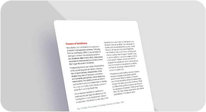 Causes of loneliness departure of an older child from the family home. Many factors can contribute to the experience Situations that cut us off from the mainstream of of isolation and especially loneliness. Following society, such as unemployment, poverty, mental Perlman and Peplau (1984) it may be helpful to illness or old age, also put us at a heightened distinguish between the predisposing factors risk of feeling lonely, as do those in which people and situational determinants which make people need an unusual level of support: disability, drug vulnerable to loneliness and precipitating events or alcohol addiction, caring for a relative or being that trigger the onset of loneliness. a lone parent. Research carried out in the US suggests that people from ethnic minority groups Predisposing factors can include characteristics may be more prone to experiencing loneliness, of the person (e.g. low self-esteem, shyness, but there is not enough evidence in the UK lack of assertiveness), characteristics of the context to confirm this. situation (e.g. lack of resources, competitive “Precipitating events create a mismatch between environments), and general cultural values (e.g. the person’s actual social relations and the individualism). Precipitating events are factors person’s social needs or desires; a change in such as the breakup of a relationship or moving one of these two factors without a corresponding to a new community which change a person’s change in the other can produce loneliness. Finally, social life in some significant way. we believe that cognitive processes can influence Circumstances that test our resilience to the experience of loneliness.” (Perlman and Peplau loneliness include major transitions such as 1984: 23) These diverse causal factors are outlined moving home or job, bereavement, divorce schematically in the diagram below. or separation, the arrival of a new baby or the Fig. 3: Model of the causes of loneliness (Perlman and Peplau 1984) PREDISPOSING FACTORS Needed or Characteristics desired social of the person relations Mismatch of needed Experience Characteristics +PRECIPITATING and actual + Cognitions of loneliness of the situation EVENT social and attributions relations Cultural values Actual social and norms relations It is important to note that the causes of isolation and loneliness are not necessarily the same, adding more weight to the argument to treat them as separate concepts. For example, one study found that some variables were better at predicting social isolation than loneliness, while some predicted both. Isolation and loneliness 9