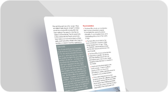 they are living each day in the ‘Jungle’. When Recommendations we visited in early August, at least 13 children, 1. The Home Office should use more discretion as well as a couple with a young child, had when it comes to the evidence required been waiting in the camp for more than six to prove family links, given a) the extreme weeks to be transferred. The UK government, vulnerability of unaccompanied minors, and b) in discussions with the French government, understanding of the context of their country have made a commitment to speed up these of origin. waits, and Home Office officials often chase up 2. The Home Office should abide by their transfers on behalf of voluntary organisations. recent commitment to respond to all take 14 Case study charge requests within ten days . If they “One 16-year-old Syrian boy had applied are misplaced, cases should be prioritised to join his family in the UK through Dublin and the child reassured and informed of the III. Not only was he vulnerable because he new timescale. was alone, but he had also been caught in 3. The Home Office should exercise discretion the crossfire of a fight in the camp that was in responding to requests – for example, nothing to do with him – he’d been badly rather than rejecting a request due to an injured and was still recovering. When he administrative error or lack of proof, instead didn’t get a response to the take charge requesting further information or correction of request, we chased up the Home Office, the mistake. who claimed it had never been received. We 4. French authorities should speed up the then turned to the French authorities, who transfer process – if there is insufficient provided proof of the date that it had been capacity of OFII or too few ad hoc sent – the Home Office then admitted that administrators, another organisation should be it had been ‘misplaced’ and promised to mandated to carry out these functions. prioritise it. The request was accepted over a 5. Once a take charge request has been month ago, but he still doesn’t have a date of accepted, and the UK is effectively responsible departure. What would have happened if we for an asylum-seeking child, the Home Office weren’t around to chase up his application? should explore ways of taking responsibility How long would he have been waiting?” for the transfer process rather than it being a Voluntary organisation member in Calais. responsibility of the French government. Photo © BRC 11 Article 16-10 to 16-13, French Civil Code. https://www.legifrance.gouv.fr/ affichCode.do;jsessionid=004CBD3DCCA0F482A837DCD60D65F317. tpdjo12v_1?idSectionTA=LEGISCTA000006136513&cidTexte=LEGITEXT000006070721&dateTexte=20120728 12 https://www.ein.org.uk/news/upper-tribunal-grants-judicial-review-brought-unaccompanied-calais-children 13 http://ec.europa.eu/dgs/home-affairs/what-we-do/policies/asylum/examination-of-applicants/docs/evaluation_of_the_ implementation_of_the_dublin_iii_regulation_en.pdf 14 https://hansard.parliament.uk/commons/2016-09-05/debates/1609052000010/FamilyReunificationEurope No place for children 11