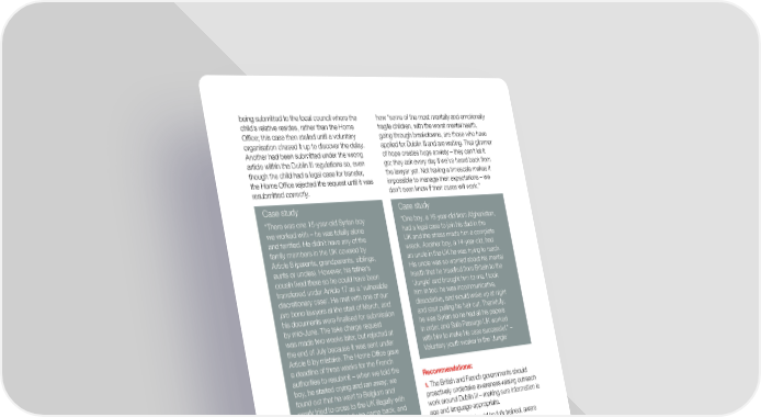 being submitted to the local council where the how “some of the most mentally and emotionally child’s relative resides, rather than the Home fragile children, with the worst mental health, Office; this case then stalled until a voluntary going through breakdowns, are those who have organisation chased it up to discover the delay. applied for Dublin III and are waiting. That glimmer Another had been submitted under the wrong of hope creates huge anxiety – they can’t let it article within the Dublin III regulations so, even go; they ask every day if we’ve heard back from though the child had a legal case for transfer, the lawyer yet. Not having a timescale makes it the Home Office rejected the request until it was impossible to manage their expectations – we resubmitted correctly. don’t even know if their cases will work.” Case study Case study “There was one 15-year-old Syrian boy “One boy, a 16-year-old from Afghanistan, we worked with – he was totally alone had a legal case to join his dad in the and terrified. He didn’t have any of the UK and the stress made him a complete family members in the UK covered by wreck. Another boy, a 14-year-old, had Article 8 (parents, grandparents, siblings, an uncle in the UK he was trying to reach. aunts or uncles). However, his father’s His uncle was so worried about his mental cousin lived there so he could have been health that he travelled from Britain to the transferred under Article 17 as a ‘vulnerable ‘Jungle’ and brought him to me. I took discretionary case’. He met with one of our him in too: he was incommunicative, pro bono lawyers at the start of March, and dissociative, and would wake up at night his documents were finalised for submission and start pulling his hair out. Thankfully, by mid-June. The take charge request he was Syrian so he had all his papers was made two weeks later, but rejected at in order, and Safe Passage UK worked the end of July because it was sent under with him to make his case successful.” – Article 8 by mistake. The Home Office gave Voluntary youth worker in the ‘Jungle’ a deadline of three weeks for the French authorities to resubmit – when we told the Recommendations: boy, he started crying and ran away; we found out that he went to Belgium and 1. The British and French governments should nearly tried to cross to the UK illegally with proactively undertake awareness-raising outreach a smuggler. Thankfully he came back, and work around Dublin III – making sure information is his take charge request was submitted in age and language-appropriate. mid-August, but we know he’s still trying to 2. Préfecture staff should be fully trained, aware cross the Eurotunnel every night.” Voluntary of and accountable for undertaking asylum organisation member in Calais. interviews and take charge requests correctly and accurately. Understandably, these delays cause the children 3. French authorities should ensure there are a to become disillusioned, frustrated and desperate. sufficient number of trained ad hoc administrators They may have stopped trying to cross to the UK to take on all current cases and attend all illegally when their cases were first taken up, but necessary appointments, investing additional as they begin to lose hope, many resume their resources if necessary. routine of sleeping during the day and risking 4. French authorities should ensure interpreters are their lives to reach the UK at night. Voluntary available, in the correct language, at the date and organisations know of at least three children who time of appointments at FTDA and the préfecture had a legal right to join family in the UK, but died – prioritising the cases of children if necessary. trying to make their own way as they waited for their cases to proceed. The case of 15-year- 5. The British government should take proactive old Masud from Afghanistan hit the headlines measures to meet remaining shortfalls – for in January 2016 when he suffocated in a lorry example, by stationing Dublin officers in Calais to crossing to the UK, having waited months to be facilitate the process and providing more funding reunited with his sister. One youth worker told us to meet capacity shortfalls. 4 http://www.defenseurdesdroits.fr/actions/protection-des-droits-libertes/decision/decision-mde-2016-113-du-20-avril- 2016-relative-la 5 http://www.defenseurdesdroits.fr/fr/actus/presse/communiques-de-presse/mineurs-non-accompagnes-le-defenseur-des- droits-salue-le-travail No place for children 7