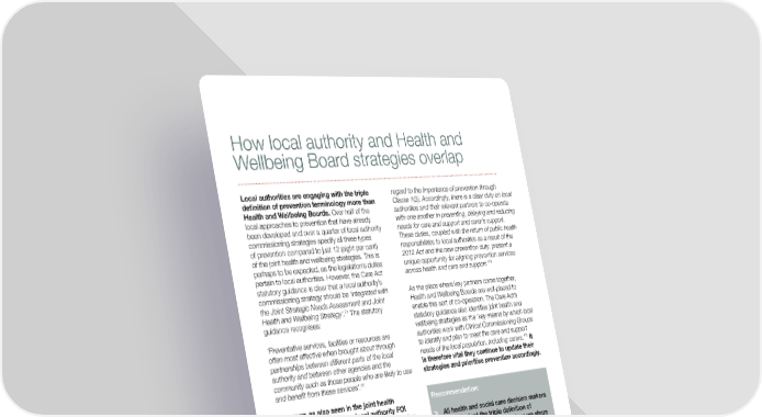 How local authority and Health and Wellbeing Board strategies overlap Local authorities are engaging with the triple regard to the importance of prevention through definition of prevention terminology more than Clause 1(3). Accordingly, there is a clear duty on local Health and Wellbeing Boards. Over half of the authorities and their relevant partners to co-operate local approaches to prevention that have already with one another in preventing, delaying and reducing been developed and over a quarter of local authority needs for care and support and carer’s support. commissioning strategies specify all three types These duties, coupled with the return of public health of prevention compared to just 12 (eight per cent) responsibilities to local authorities as a result of the of the joint health and wellbeing strategies. This is 2012 Act and the new prevention duty, present a perhaps to be expected, as the legislation’s duties unique opportunity for aligning prevention services 73 pertain to local authorities. However, the Care Act across health and care and support.’ statutory guidance is clear that a local authority’s commissioning strategy should be ‘integrated with As the place where key partners come together, the Joint Strategic Needs Assessment and Joint Health and Wellbeing Boards are well-placed to 71 Health and Wellbeing Strategy’. The statutory enable this sort of co-operation. The Care Act’s guidance recognises: statutory guidance also identifies joint health and wellbeing strategies as the ‘key means by which local ‘Preventative services, facilities or resources are authorities work with Clinical Commissioning Groups often most effective when brought about through to identify and plan to meet the care and support 74 partnerships between different parts of the local needs of the local population, including carers.’ It authority and between other agencies and the is therefore vital they continue to update their community such as those people who are likely to use strategies and prioritise prevention accordingly. 72 and benefit from these services’. However, as also seen in the joint health Recommendation: and wellbeing strategies, local authority FOI responses sometimes demonstrated confusion > All health and social care decision makers as to what constitutes primary, secondary or should adopt the triple definition of tertiary prevention. They also cited more prevention terminology – unless we share primary and secondary preventative the same language, we can’t be sure we interventions than tertiary. share the same ambition. As we move to increased integration and joint-working Finally, a number of local authorities referred to joint this will become ever more important health and wellbeing strategies in their responses to one or more of the questions asked in the FOI request. While – as noted above – this connection is welcome, it is particularly concerning that only around a third of the joint health and wellbeing strategies have been updated since 2014 and fewer than a quarter mention the Care Act (or Care Bill). Under Sections 6 and 7 of the Care Act, local authorities and their relevant partners must ‘co- operate’ in order to carry out their various functions. 68. Department of Health (October 2014), Care and Support Statutory Guidance, Chapter 2 Earl Howe noted how this relates to prevention: (“Developing a local approach to preventative support”), Section 2.23 69. Department of Health (October 2015), Care and Support Statutory Guidance, Chapter 2 (2.5) 70. Department of Health (October 2015), Care and Support Statutory Guidance, Chapter 2 (2.24) ‘Such co-operation is to be performed for the 71. Department of Health (October 2015), Care and Support Statutory Guidance, Chapter 4 (4.51) 72. Department of Health (October 2015), Care and Support Statutory Guidance, Chapter 2 (2.30) purposes of, among other things, promoting an 73. Earl Howe, The Parliamentary Under-Secretary of State at the Department of Health (3 July individual’s well-being, which in turn includes having 2013): publications.parliament.uk/pa/ld201314/ldhansrd/text/130703-0003.htm 74. Department of Health (October 2015), Care and Support Statutory Guidance, Chapter 15 (15.9) British Red Cross Prevention in action advocacy@redcross.org.uk l l 23