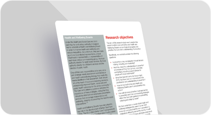 Health and Wellbeing Boards Research objectives Under the Health and Social Care Act 2012 The aim of this research study was to explore the each top tier and unitary authority in England extent to which local authorities and Health and had to establish a Health and Wellbeing Board Wellbeing Boards across England recognise and in order to improve health and wellbeing and prioritise the Care Act’s understanding of prevention. reduce inequalities. As a minimum, they are made up of one local elected representative, a local Specifically, we wanted to answer the following Healthwatch representative, a representative of questions: each local clinical commissioning group, the local authority director for adult social services, the local > Is pr evention a key consideration in local decision authority director for children’s services and the making, including commissioning? director of public health. One of their core responsibilities is to carry out a > And if so, does the understanding of ‘pr evention’ joint strategic needs assessment and develop a encompass all three tiers (primary, secondary joint health and wellbeing strategy that meets the and tertiary), including support services for needs identified in that assessment. Both should people with lower-level needs? ‘sit at the heart of local commissioning decisions, > Since the Car e Act came into force in April underpinning improved health, social care and 2015, has there been an improvement in the 24 prioritisation and understanding of prevention? public health outcomes for the whole community.’ > How do local authorities and Health and The Care Act’s statutory guidance reiterates the Wellbeing Boards plan to put prevention into importance of these strategies, noting that they action? ‘should be informed and emphasise preventative services that encourage independence and > How well do local authorities’ local appr oaches wellbeing, delaying or preventing the need for acute to prevention and their commissioning strategies 25 reflect the Care Act’s guidance on preventing, interventions.’ reducing and delaying needs? Health and Wellbeing Boards have also played a key role in the development of Better Care Fund We have undertaken a review of joint health and plans. The £5.3 billion Better Care Fund (previously wellbeing strategies two years in a row. Both called the Integration Transformation Fund) created times we concluded that the term ‘prevention’ is a local, single-pooled NHS and local authority understood differently across the country. In both budget to encourage health and social care 2013/14 and 2014/15 many strategies understood integration. The Chancellor committed an extra prevention only as minimising the risk of people £1.5 billion to the Better Care Fund by 2019-20 developing care and support needs in the first place as part of its ‘radical, local-led plan to create an (primary prevention) or as targeting people at high 26 integrated health and social care system by 2020’ risk of developing needs (secondary prevention). during his 2015 Spending Review. With this in mind, we also wanted to explore the Leaders of the social care sector are concerned following question: about the time-frame of this funding, noting that > Has ther e been an improvement in Health and it does not reach ‘levels of any significance until towards the end of this parliament.’ They also warn Wellbeing Boards’ understanding of prevention this puts ‘the delivery of the NHS Five Year Forward in light of the Care Act’s triple definition of 27 prevention? View and the Care Act at risk.’ Others have reiterated the importance of this being ‘new money’ 28 and ‘spent on adult social care.’ 24. Department of Health (2011), Joint strategic needs assessment and joint health and wellbeing strategies explained: gov.uk/government/uploads/system/uploads/attachment_data/file/215261/ dh_131733.pdf 25. Department of Health (October 2014), Care and Support Statutory Guidance, Chapter 4 (4.53) 26. HM Treasury (25 November 2015), Spending review and autumn statement 2015: gov.uk/government/publications/spending-review-and-autumn-statement-2015-documents/spending-review-and- autumn-statement-2015#a-sustainable-health-and-social-care-system-1 27. Joint letter for the Chancellor and Secretaries of State, from Care and Support Alliance, Association of Directors of Adult Social Services, Care Provider Alliance, NHS Confederation (December 2015): careandsupportalliance.com/social-care-sector-response-to-the-spending-review/#sthash.eS0VEpiv.dpuf 28. Lord Porter, Chairman of the Local Government Association (25 November): local.gov.uk/spending-review/-/journal_content/56/10180/7586753/NEWS British Red Cross Prevention in action advocacy@redcross.org.uk 10 l l