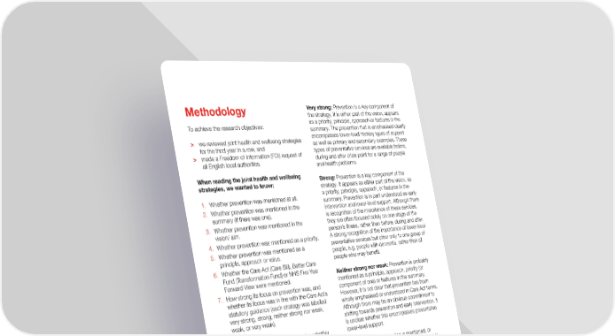 Methodology Very strong: Prevention is a key component of the strategy. It is either part of the vision, appears To achieve the research objectives: as a priority, principle, approach or features in the summary. The prevention that is emphasised clearly > we reviewed joint health and wellbeing strategies encompasses lower-level/ tertiary types of support for the third year in a row, and as well as primary and secondary examples. These > made a Freedom of Information (FOI) request of types of preventative services are available before, all English local authorities. during and after crisis point for a range of people and health problems. When reading the joint health and wellbeing Strong: Prevention is a key component of the strategies, we wanted to know: strategy. It appears as either part of the vision, as 1. Whether prevention was mentioned at all. a priority, principle, approach, or features in the summary. Prevention is in part understood as early 2. Whether prevention was mentioned in the intervention and lower-level support. Although there summary (if there was one). is recognition of the importance of these services, 3. Whether pr evention was mentioned in the they are often focused solely on one stage of the vision/ aim. person’s illness, rather than before, during and after. 4. Whether prevention was mentioned as a priority. A strong recognition of the importance of lower-level 5. Whether pr evention was mentioned as a preventative services but often only to one group of principle, approach or value. people, e.g. people with dementia, rather than all 6. Whether the Car e Act (Care Bill), Better Care people who may benefit. Fund (Transformation Fund) or NHS Five Year Neither strong nor weak: Prevention is probably Forward View were mentioned. mentioned as a principle, approach, priority (or 7. How str ong its focus on prevention was, and component of one) or features in the summary. whether its focus was in line with the Care Act’s However, it is not clear that prevention has been statutory guidance (each strategy was labelled wholly emphasised or understood in Care Act terms. very strong, strong, neither strong nor weak, Although there may be an obvious commitment to weak, or very weak). shifting towards prevention and early intervention, it is unclear whether this encompasses preventative The purpose of 2 to 5 was to determine whether lower-level support. there is any sort of emphasis on prevention. Generally, joint health and wellbeing strategies have Weak: Although prevention is mentioned, or an overriding ‘vision’ or ‘aim’, a set of ‘priorities’ may exist as a component of a priority, principle, (usually between three and five but sometimes approach, or may feature in the summary, it clearly more) and some guiding ‘principles’, ‘approaches’ only focuses on preventing a problem from arising or ‘values’. These tend to frame the strategies and through awareness raising or education (e.g. indicate their main areas of focus. preventing underage pregnancy by investing in sexual education). The purpose of 6 was to help determine whether national policy and practice developments have Very weak: No emphasis of any kind on prevention. translated into local plans. It’s important to note that some strategies were The purpose of 7 was to evaluate whether its due to be reviewed while completing this project interpretation of prevention was in-line with the Care and were subject to change. Moreover, they ranged Act’s statutory guidance. The labels (very strong, in length, detail and had different timeframes. strong, neither strong nor weak, weak, very weak) The combination of these factors makes the were ascribed according to whether prevention labels attributed to the strategies subjective and was a key element of the strategy and whether presumably temporary. Therefore, these results are prevention seemed to encompass lower-level/ intended to provide a guide as to the strength of the tertiary types of support as well as primary and strategies’ focus on prevention, as well as a guide to secondary examples. the year-on-year trend British Red Cross Prevention in action advocacy@redcross.org.uk l l 11