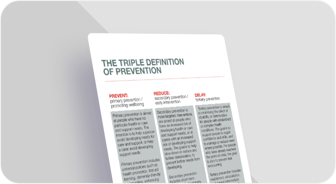THE TRIPLE DEFINITION OF PREVENTION PREVENT: REDUCE: primary prevention / secondary prevention / DELAY: promoting wellbeing early intervention tertiary prevention Primary prevention is aimed Secondary prevention is Tertiary prevention is aimed at people who have no more targeted. Interventions at minimising the effect of particular health or care are aimed at people who disability or deterioration and support needs. The have an increased risk of for people with established intention is to help a person developing health or care or complex health avoid developing needs for and support needs, or at conditions. The goal is to care and support, or help carers with an increased support people to regain a carer avoid developing risk of developing support confidence and skills, and support needs. needs. The goal is to help to manage or reduce need slow down or reduce any where possible. For people Primary prevention includes further deterioration, to who have already reached universal policies such as prevent further needs from the point of crisis, the goal health promotion, first aid developing. is also to prevent that learning, dementia-friendly reoccurring. communities, enhancing Secondary prevention factors that are known includes short-term Tertiary prevention includes to help protect all people provision of wheelchairs, reablement, rehabilitation, (e.g. having a sense of handyman services, ‘social bed-based intermediate belonging, enjoying good prescribing’ services, care, outpatient diabetic relationships, housing telecare, earlier diagnosis, and vascular support, and good physical e.g. The NHS Health Check support to self-manage health), raising awareness programme/ screenings conditions, medical initiatives such as National etc., more targeted adherence programmes, HIV Testing Week, vaccinations (e.g.. the flu home adaptations, 6 universal services such as jab given to people assistive technology... community activities that over 65...) prevent social isolation, universal vaccinations (e.g. polio vaccine...) 6. Please note that there is no hard and fast rule as to where each of these examples fit – of course, some examples could apply to more than one type of prevention. Before using these examples it is important to think about the particular condition as well as the stage of the condition you are applying it to. It is, however a useful way of ensuring preventative interventions are being adopted across the pathology of a condition or illness. British Red Cross Prevention in action advocacy@redcross.org.uk l l 5
