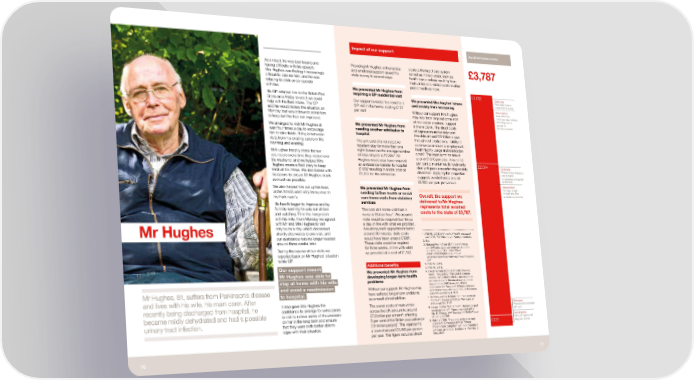 Impact of our support Avoided state costs As a result, he was bed-bound and Providing Mr Hughes with practical costs to the healthcare system having difficulty with his speech. and emotional support saved the as well as indirect costs, such as £3,787 Mrs Hughes was finding it increasingly state money in several ways: health complications resulting from difficult to care for him, and he was malnutrition and related costs to other refusing to drink or co-operate public health services. with her. We prevented Mr Hughes from £1,152 His GP referred him to the British Red requiring a GP residential visit Outcome We prevented Mrs Hughes’ stress Prevented home Cross on a Friday to see if we could Our support avoided the need for a and anxiety from worsening visits from a nurse help with his fluid intake. The GP GP visit in the home, costing £121 Assumption 1. Assumed four said he would review the situation on per visit Without our support, Mrs Hughes visits per day, initially, Monday, but would have to admit him may also have required some sort reducing over a to hospital if he had not improved. of medical or emotional support period of We prevented Mr Hughes from in the midterm. The direct costs for three weeks We arranged to visit Mr Hughes at needing another admission to of depression and anxiety cost least four times a day to encourage hospital the state around £22 billion a year him to take fluids, fitting in between through lost productivity, inability to visits from his existing carers in the The unit cost of a non-elective commence or return to employment, morning and evening. inpatient stay for more than one health facility usage and medication Mr Hughes happily drank for our night (based on the average number costs8. This represents an annual 2 volunteers every time they visited over of days stayed) is £2,334 . Mr cost of £7,875 per case. Around 35 the weekend, and we helped Mrs Hughes would also have required per cent of mental health treatments Hughes create a fluid diary to keep an ambulance transfer to hospital deal with people experiencing anxiety £2,514 Outcome 3 Prevented ambulance (£180) resulting in a total cost of 9 track of his intake. We also liaised with £2,514 for the admission. disorders . Applying this proportion call out and his carers to ensure Mr Hughes drank suggests avoided costs around unnecessary hospital as much as possible. £2,620 per year, per person. admission We also helped him cut up his food, We prevented Mr Hughes from Assumption Average length as his hands were very shaky due to needing further health or social of stay and one his Parkinson’s. care home visits from statutory Overall, the support we ambulance transfer services delivered to Mr Hughes His health began to improve and by represents total avoided Sunday evening he was out of bed The cost of a home visit from a costs to the state of £3,787. 4 and watching TV in the living room nurse is £64 an hour . We assume with his wife. From Monday we agreed visits would be required four times with Mr and Mrs Hughes to visit a day, in line with what we provided. only twice a day, which decreased Assuming each appointment lasted Mr Hughes shortly afterwards to one visit, until around 30 minutes, daily costs 1. PSSRU (2011), Unit costs of health and social our assistance was no longer needed would have been around £1285. care 2011, The University of Kent publications. around three weeks later. These visits would be required 2. Ibid. 3. National Audit Office (2011), Transforming During the course of our visits we for three weeks, in line with what the NHS ambulance services: presentation we provided at a cost of £1,152. to the House of Commons. http:// reported back on Mr Hughes’ situation www.connectingforhealth.nhs.uk/ to his GP. systemsandservices/pathways/news/fullreport. pdf Additional benefits 4. PSSRU (2011). Our support meant 5. PSSRU (2011). Mr Hughes was able to We prevented Mr Hughes from 6. Elia (Chairman & Editor) Stratton, Russell, developing longer-term health Green, Pan; (2005); “The cost of disease- stay at home with his wife related malnutrition in the UK and economic problems considerations for the use of oral nutritional and avoid a readmission supplements (ONS) in adults”. British Without our support, Mr Hughes may Association for Parenteral & Enteral Nutrition. Mr Hughes, 81, suffers from Parkinson’s disease to hospital. have suffered longer-term problems http://www.teespublichealth.nhs.uk/document. aspx?id=3202&siteID=1012 and lives with his wife, his main carer. After as a result of malnutrition. 7. McKinlay (2008) “Malnutrition: the spectre at It also gave Mrs Hughes the the feast”, Journal of College Physicians of recently being discharged from hospital, he The overall costs of malnutrition Edinburgh 38:317–21 Outcome confidence to arrange for extra carers across the UK amount to around 8. Layard (2005), “Mental health: Britain’s largest Prevented residential became mildly dehydrated and had a possible to visit to relieve some of the pressure social problems?”, Paper presented at the GP visit 6 No. 10 Strategy Unit Seminar on Mental Health on her in the long term and ensure £7.3 billion per annum , affecting Assumption urinary tract infection. 5 per cent of the British population (or 20 January 2005 One GP visit to Mr that they were both better able to 7 9. Hallam (2008), “The social costs of anxiety £121 Hughes’ home cope with their situation. 2.9 million people) . This represents disorders”, Congresso Istituto Tolman: a cost of around £2,483 per person, Psicoterapia competenti per la communita: I per year. This figure includes direct percorsi, gli ostacoli, le soluzioni. Palermo, 3 Dec, 2006. 10 11