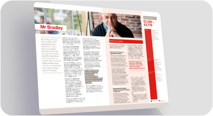 Avoided state costs £3,262 – £5,776 £2,514 Outcome Prevented ambulance call out and Mr Bradley unnecessary hospital admission Assumption One ambulance transfer and inpatient hospital stay (average length) Mr Bradley was referred to the nurse, linking him into a local Impact of our support Mr Bradley, 50, lives British Red Cross as he could not befriending service, and organising cope alone and particularly needed a meeting with the Citizens Advice alone, suffers from help with paperwork, which he was Bureau, who helped him get in touch 2 finding overwhelming. with a solicitor to discuss his house Providing practical and emotional cent of the total NHS budget . The agoraphobia and and children. We were also support to Mr Bradley saved the annual cost of treating diabetes and 3 depression, and is From an initial visit to Mr Bradley, able to organise support for Mr Bradley state money in two ways: complications is £2,944 per person. we found that he was extremely from Age UK. Complications with the condition type one diabetic. depressed and lonely. He was account for around 35 per cent of 4 His relationship with not eating or drinking much, often After a period of intensive support, We prevented Mr Bradley’s this (or £1,035) . It is possible that going for days with no food. This we continued to visit Mr Bradley depression worsening without our intervention this would his long-term partner was particularly concerning given and help him set up longer-term Ongoing and worsening depression have led to a hospital admission, his diabetes and regular insulin solutions. He now has a befriending including ambulance transfer (£1805) recently broke down, can increase the likelihood of a 6 injections. He was also very worried volunteer, a counsellor, regular suicide attempt or a long recovery and inpatient stay (£2,334 ). and he has had no about his finances as his ex-partner appointments with the diabetic period. It is likely that without our £1,035 £3,262 contact with her or his had dealt with money issues. nurse and better control of his health support Mr Bradley’s depression Overall, the support we We visited Mr Bradley once a day and personal care. He also has would have worsened, to the extent delivered to Mr Bradley Outcome three children since. and offered practical and emotional a better outlook on life and feels he would have required some at- Prevented diabetic He has no other family support to help him get back on he has the support to cope with home medical assessment and care. represents total avoided complication his feet. We helped him with his day-to-day life and start regaining costs to the state of Assumption and only one close paperwork, and in the course of this his independence. It is likely Mr Bradley would have between £3,262 and £5,776. Cost of treating required a residential GP visit to diabetic complication friend in the area. support we discovered he had bank Our support allowed (35 per cent of total accounts in his name that he was assess his mental health, and cost) for one year unaware of, and that his ex-partner Mr Bradley to start would have then needed support £2,227 had taken both his passport and regaining his from social services home care. A Outcome birth certificate with her. residential GP visit costs, on average, Prevented GP visit independence and £121 and home care support for and home care support We alerted the safeguarding rebuilding his confidence service users with mental health 1. PSSRU (2011), Unit costs of health and Assumption 1 social care 2011, The University of Kent officer to Mr Bradley’s financial while learning new ways problems costs £162 per week . It is One GP visit and concerns. We helped him fill out likely that social care support would publications. £21 represents the cost of a home care support to cope. community nurse, per visit (pages 106-108, for 13 weeks forms to declare his passport and be needed weekly for three months taken from: Community Care Packages for birth certificate as lost or stolen (13 weeks) at a cost of £2,227. Older People). We assume this is a low bound He said the support he received figure representing the fact that Mr Bradley was and helped him complete and send from the British Red Cross gave him unable to cope with daily necessities himself, his benefits forms. We also fed e.g. food preparation. back to Mr Bradley’s GP our fantastic emotional support at his We prevented Mr Bradley’s 2. Diabetes in the UK (2004), a report from lowest point and helped him to Diabetes UK available at www.diabetes.org. concerns about his diet, and diabetes worsening and causing uk/Professionals/Publications-reports-and- organised regular deliveries of start taking back control of his life. complications resources/Reports-statistics-and-case-studies/ Reports/Diabetes_in_the_UK_2004/ prepared meals to ensure that he Mr Bradley was not providing for 3. Ibid. would be eating properly. 4. Ibid. his own basic needs, which could 5. National Audit Office (2011), Transforming the NHS We then put Mr Bradley in touch with have had very harmful effects ambulance services: presentation to the House of Commons. www.connectingforhealth.nhs.uk/ various other forms of help, including alongside his diabetic condition. systemsandservices/pathways/news/fullreport. arranging a visit from his diabetic The cost of treating diabetes and pdf. The unit cost for ambulance services ranges from £144 to £216, i.e. a mean unit cost for this is its associated complications is £180 per call. significant, comprising around 5 per 6. PSSRU (2011). Projected savings Potential additional savings 2 3