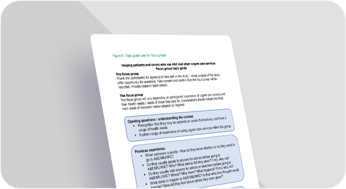 !021 5% % 5 3** # < # * * ' * 1 5 %5 5 J%555 55 ? "1% % & % 56 % "/ % & " # * 1 % 5 5 5 %5 E5 % %% C % ", % & % 6 5 ?" Opening questions / understanding the context · Recognition that they may be patients or carers themselves, and have a range of health needs · Explore range of experience of using urgent care services within the group. Previous experience: · When someone is poorly - How do they know whether or not they need to go to A&E/MIU/WIC? · Do they usually speak to anyone for advice before going to A&E/MIU/WIC? Who? What advice did they seek? If not, why not? · Do they usually visit anyone for advice or treatment before going to A&E/MIU/WIC? Where? Why there? What happens? If not, why not? · What tends to happen at A&E/MIU/WIC? Is that what they thought would happen? How did they feel about advice they were given? In the future: · If they, or other people, were in the same situation, is there information or advice that would be helpful to know before having to decide to go to A&E/MIU/WIC? · Are there any practical skills that they or someone in their situation, might have found helpful to know before having to decide to go to A&E/MIU/WIC? · Are there other groups of people that they think the British Red Cross could help in addition to / instead of, themselves? · ) E & 6 & 5 % 56 6 %4 · 1 5 %5 55 5L 55 % 5 %5 " ('