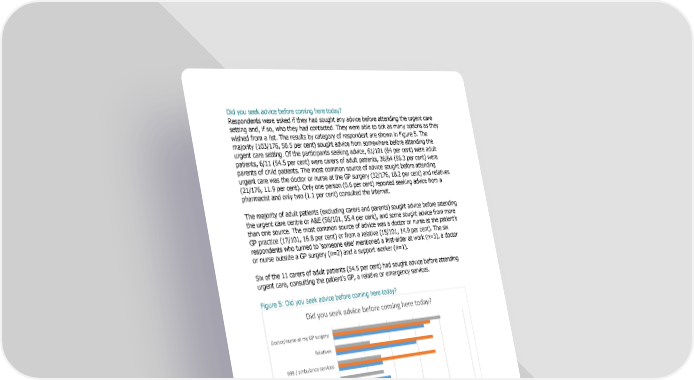 %6 % & 4 -5 %6 % % % "1 6 %& 5 & "1 6 % 5 !'"1 &9 A.8 C.*('+"'5% B % & &6 % "G 5 %5 %(.C.8.A(#5% B 5 (C..A'#"'5% B% 5 (C(#A'(" 5% B 5 %5 "1& % && % % 6 % % I/ A C.*(.+"5% B A.C.*(.."05% B"G 5 A8"(5% B5 % & 5&% A.".5% B% " 1&9 5 A% % 5 B %6 %% $;A'(C.8.''"#5% B & % && %"1& % && % % % 5 E I/5% %A.*C.8..("+5% B & A.'C.8..#"05% B"1 5 H & E& 7 A M B % I/ A MB 55 A M.B" 3 ..% 5 A'#"'5% B %6 %% 5 EI/ & % %" !'2 %6 % & 4 Did you seek advice before coming here today? Doctor/nurse at my GP surgery Relatives 999 / ambulance services NHS 111 Someone else Another treatment centre Friends/neighbours Internet Pharmacist 0 5 10 15 20 25 Percentage of respondents Parents of child patients (N=64) Carers of adult patients (N=11) Adult patients (N=101)