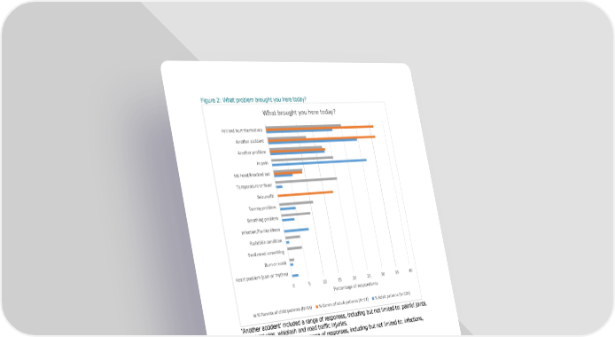 !2 5 6&6 4 What brought you here today? Fell and hurt themselves Another accident Another problem In pain Hit head/knocked out Temperature or fever Seizure/fit Tummy problem Breathing problem Infection/flu-like illness Rash/skin condition Swallowed something Burn or scald Heart problem (pain or rhythm) 0 5 10 15 20 25 30 35 40 Percentage of respondents % Parents of child patients (N=64) % Carers of adult patients (N=11) % Adult patients (N=101) H$ %% E % 5 % 6 & 25 9 5 95 % 9" H$ 5 6&E % 5 % 6 & 2 % 6 5 6& " .0