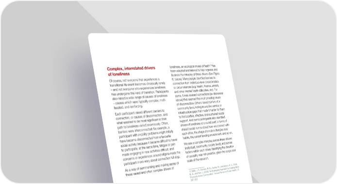 12 Complex, interrelated drivers loneliness, an ecological model of health has of loneliness been adapted and tailored to help organise and illustrate the interplay of these drivers (See Figure Of course, not everyone that experiences a 6, below). Many people identified barriers to transitional life event becomes chronically lonely connection from individual-level characteristics – and not everyone who experiences loneliness or circumstances (e.g. health, finance, anxiety has undergone this kind of transition. Participants and other mental health difficulties, etc). For also raised a wide range of causes of loneliness some, it was severed connections (as discussed – causes which were typically complex, multi- above) that seemed the most pressing cause faceted, and reinforcing. of disconnection. Others raised barriers at a Each participant raised different barriers to community level, noting issues like service or connection, or causes of disconnection, and infrastructure gaps that made it harder for them what seemed to be most significant in their to find positive, effective, and sustained social path to loneliness varied enormously. Often, support. And some participants also identified barriers were interconnected: for example, a drivers of loneliness at a social level: in terms of participant with mobility problems might initially shared social norms about how we connect with have become disconnected from a favourite each other, the shape of modern lifestyles and social activity because it became difficult to travel habits, the current funding environment, and so on. to participate; at the same time, fatigue or pain We saw a complex interplay across these drivers made engaging in new activities difficult; and (individual, community, society level), and across concerns or experiences around stigma made the factors within each driver. Identifying the direction participant more wary about connection full stop. of causality was not possible, given the scope and As a way of summarising and making sense of scale of the research. these varied and often complex drivers of 12 Sallis, J. F., Cervero, R. B., Ascher, W., Henderson, K. A., Kraft, M. K., and Kerr, J. (2006) “An Ecological Approach to Creating More Physically Active Communities”, Annual Review of Public Health, 27, 297–322 Figure 6. Other drivers of loneliness and barriers to connection c Social and cultural norms, work/life o ie t S y balance, stigma, digital age, insular communities, political landscape, mmun o ity C financial hardships nec t on ion Social activities, funding cuts, C s Indi- statutory services, transport, vidual neighbourhood safety Friends and acquaintances, family, colleagues Sense of self, health, income, energy, confidence, emotions, perceptions What causes loneliness, and how can it become chronic? 21