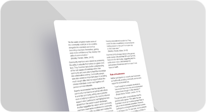 “As the weeks progress maybe some of housing associations/councils too? They the community could join in the activities could circulate newsletters to tenants/owners alongside the volunteers and end up inviting people to take part in an open day becoming volunteers themselves, gaining in their close area.” even more conidence as they develop new (Mobility, Female, Wales, 24-35) skills of communication.” One third (34%) of respondents to the general (Mobility, Female, Wales, 24-35)public survey indicated that GPs and the NHS Community members were viewed as possessing had a lot of a role to play, suggesting that the the ability to educate themselves at a grass-roots public does make a link between the level. They therefore had a better understanding seriousness of loneliness and the impact it can of the root causes of loneliness within their have on health. community and were able to feed this knowledge into collaborative working. Community groups were also viewed an important player in providing Role of businesses much sought-after informal support where like-Neither participants nor experts saw businesses minded individuals could meet together and as traditionally providing community services and pursue common interests. support to tackle loneliness. Experts recommended that the capacity for “I can't speak for businesses /workplaces, community members to empathise with others how would they know they are lonely/isolated in a similar community setting was a potential unless it was brought to their attention?” route to helping to address the need for informal (Empty Nester, Female, London, 55-74) support which participants had highlighted was absent from the current support landscape. The general public survey indicates that the Another suggestion for ways in which community general public agrees: 10% state they see members could tackle loneliness at a community business in local communities as least likely to level, was their ability to initiate and mobilise the play a role in loneliness prevention. However, community around shared interests and common participants and experts did think that business grounds (i.e. shared meals, neighbourhood could have a role. For example, local businesses gardening programmes, etc.).are well-placed to host and deliver activities in “I think doing an activity that people will enjoy the community, creating opportunities for members in their community to connect with with people like them will help them to open others. Funding cuts to local services led experts up with each other and help people to bond to see businesses as having a role to play in and make new connections.” funding initiatives in partnership with local (Young new mum, Female, Belfast, 18-24)service providers. As participants stressed that accessing services Role of ‘trusted advisors’ and support located near home or where they run errands would increase the likelihood of them Participants and experts noted the importance taking up support, local businesses were seen of ‘trusted advisors’, such GPs, local authorities as important community hubs and as having and housing associations, in identifying those locations in communities with high traffic from experiencing loneliness and connecting them individuals and thus could advertise and to support. These advisors have existing signpost their customers to available local relationships with individuals and as part of services and support. their advisory function, could signpost to social support and activities. The potential impact business owners and “As well as employers and businesses workers have on those experiencing loneliness also cannot be dismissed; chronically lonely supporting in the workplace, why not the What kind of support do people want and how do they want support delivered? 45