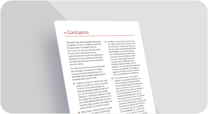 7. Conclusions This research has demonstrated the seriousness Loneliness can have serious consequences ¤ of loneliness, not only to individuals experiencing and negative impacts at both a personal and the issue but also its potential impact on community level. Loneliness can cause and, communities, our economy, and wider society. at times, worsen existing personal problems We are now at a critical juncture where (psychological, social, and behavioural) supporting those who are at risk of experiencing and community level issues (fewer social loneliness to become reconnected with society connections, lack of confidence to leave can help those individuals as well as strengthen the home). Loneliness also has serious their communities. consequences for isolated individuals The following conclusions provide useful insights including increased morbidity, lower life into what support and services are needed satisfaction, and a predisposition towards low to help people before loneliness becomes mental and physical health. It can affect all embedded, and importantly engage those who aspects of their life, including an impact on are already feeling disconnected:other social relationships and behaviours. There is low awareness of the support Loneliness is viewed as a serious and urgent ¤ ¤ available to help people reconnect and the public issue, which is a common experience current landscape is viewed as not fit for in the UK. Yet the public perception of purpose outside of supporting older people. those who experience loneliness was out of Services were viewed as piecemeal and sync with the reality and there are existing fragmented. The key reason for participants challenges to framing this outside of an ‘older not accessing support was the lack of life’ problem. More attention could be given to awareness of the availability of services promote the idea that loneliness can happen and support relevant to them. One off/short across life stages, genders, and backgrounds term interventions were also viewed as and is not solely connected with later life.problematic. When services or support were Although age is well-documented in current ¤ accessed it was often too formal, did not literature as a risk factor to experiencing provide tailored support or was difficult loneliness, this research confirmed that to attend habitually due to location and people experiencing life events which can transport issues. Services and support disrupt existing connections are also at were signposted as needing to be tailored, risk. This ‘break of routine’ or disruption to sustainable, accessible, and targeted to identity which sees a new identity take hold is distinct stages of need. sometimes caused by a sudden or expected People who already find maintaining social life transition and therefore identifiable or ¤ preventable. Recognising this risk should relationships challenging due to other factors enable preventative and early reactive support (such as health issues or physical isolation) to be developed with people undergoing are more likely to be at risk of experiencing significant life changes. loneliness. People who face barriers in terms of other life stresses such as mental health Those experiencing loneliness can view ¤ or physical isolation are more at risk of connection with others as a daunting transitioning to chronic loneliness than others. experience, and this can result in questions The causes of loneliness are often multi- around self-worth. Chronic loneliness can ¤ therefore develop within the context of a layered and reinforcing. As loneliness is a newly emerging identity which can in turn lead complex issue which is often caused by a to difficulties re-connecting and the potential combination of personal, community and for reduced self-worth. At worst, people broader society issues, people experiencing experiencing loneliness felt they had little to loneliness need different types of support offer society and described suicidal thoughts.depending on their individual circumstances (preventative, responsive, restorative). To Conclusions 49
