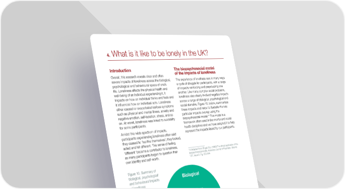 4. What is it like to be lonely in the UK? Introduction The biopsychosocial model Overall, this research reveals clear and often of the impacts of loneliness severe impacts of loneliness across the biological, The experience of loneliness was in many ways psychological and behavioural space of one’s a cycle of struggle for participants, with a range life. Loneliness affects the physical health and of impacts reinforcing and perpetuating one well-being of an individual experiencing it, it another. Like many complex social problems, impacts on how an individual thinks and feels and loneliness also clearly involved negative impacts it influences how an individual acts. Loneliness across a range of biological, psychological and either caused or exacerbated serious symptoms social domains. Figure 10, below, summarises such as physical and mental illness, anxiety and these impacts and helps to illustrate the way negative emotion, self-isolation, stress, and so particular impacts overlap using the 14 on. At worst, loneliness was linked to suicidality biopsychosocial model. This model is a for some participants. framework often used in the mental and social Amidst this wide spectrum of impacts, health disciplines and we have adapted it to help participants experiencing loneliness often said represent the impacts faced by our participants. they ceased to ‘feel like themselves’; they looked, acted and felt different. This sense of feeling ‘different’ became a contributor to loneliness, as many participants began to question their 14 Adapted from: Engel, G.L. (1980) The clinical application of the own identity and self-worth. biopsychosocial model. American Journal of Psychiatry. Volume 137, Issue 5. Pg. 535-544 Figure 10. Summary of biological, psychological and behavioural impacts Biological of loneliness Increased illness Worsening symptoms Low energy Stress, Anxiety Insomnia Mood disorders Hypervigilance Over/under eating IDENTITY CRISIS Low confidence Disengagement Negative emotions Self-isolation thoughts and beliefs Stop Poor work/ Weak ‘coping’ skills planning hobby performance Suicidality Social Poor hygiene skills Reduced exercise Psychological Behavioural What is it like to be lonely in the UK? 31