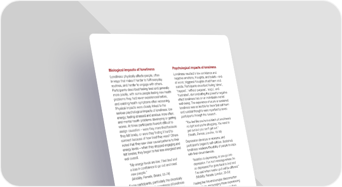 Biological impacts of lonelinessPsychological impacts of loneliness Loneliness physically affects people, often Loneliness resulted in low confidence and in ways that make it harder to fulfil everyday negative emotions, thoughts, and beliefs – and routines, and harder to engage with others. at worst, triggered thoughts of self-harm and Participants described feeling tired and generally suicide. Participants described feeling ‘alone’, more poorly, with some people feeling new health ‘trapped’, ‘without purpose’, ‘angry’, and problems they had never experienced before, ‘frustrated’, demonstrating the powerful negative and existing health symptoms often worsening. effect loneliness has on an individual’s mental Physical impacts were closely linked to the well-being. The experience of acute or sustained serious psychological impacts of loneliness: low loneliness was so terrible for them that self-harm energy; feeling stressed and anxious more often; and suicidal thoughts were reported by seven and mental health problems developing or getting participants through the research. worse. At times participants found it difficult to “You feel like you’re in a black pit and there’s assign causation – were they more tired because no light and you’re struggling. You want to they felt lonely, or were they finding it hard to get out but you can’t get out.” connect because of how tired they were? Others (Health, Female, London, 18-34) noted that they saw clear causal patterns to their energy levels – when they stopped engaging and Depression develops or worsens, and felt lonelier, they began to feel less energised and participants began to self-criticise. Sustained well overall. loneliness weakens the ability of people to cope “My energy levels are low, I feel tired and with their circumstances. a loss in conidence to go out and meet “Isolation is depressing, so you go into new people.” depression. I’ve had mornings where I’m so depressed I’ve gone back to bed and (Mobility, Female, Bristol, 55-74)I’ve said when I wake up it will be diferent.” Some participants, particularly the chronically (Mobility, Female, London, 35-54) lonely, described their experience of loneliness as resulting in what is known as hypervigilance Feeling like this encourages disconnection in social situations in the mental health space. from others, encouraging those experiencing They felt ‘especially anxious’ and ‘out of practice’ loneliness to shut themselves away from in social situations, which led to them feeling encounters with other people. Adding to the ‘over-sensitive’ to how others were viewing difficulty, loneliness prevents some people from them and made even simple interactions more planning for the future, instead leaving them overwhelming. Participants felt stuck in a negative unable to see the potential ahead and thinking feedback loop – it was too hard to engage with ‘what’s the point?’ and ‘what good am I?’ other people, which meant that they withdrew from social environments, which in turn made them feel even more isolated and ‘out of practice’ for the future. Every retreat meant that the stakes were raised for future interactions. What does it feel like to be lonely? I can tell you exactly, it’s like being in a bubble and you want to get out but you just can't, you try and you can’t do it, you just can’t get out. (Health issues, Male, Wales, 55-74) What is it like to be lonely in the UK? 32