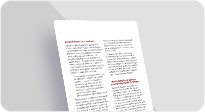 Behavioural impacts of lonelinessThe behavioural impacts of loneliness extended People act differently when they are lonely and beyond the individual experiencing loneliness; some of these behaviours pose their own barriers for example those experiencing loneliness may for connections. Participants described shutting off also be contributing less to the economy and to from others, engaging or talking less. Friendships their communities. and acquaintances were weakened or lost Unfortunately, many of these physical ‘signs’ altogether, removing for some what little social of loneliness are also fairly hidden, and may be support they had. Some also said that when they symptomatic of other personal issues – making it were connecting with others less, or felt more difficult to identify people who are feeling affected lonely, they also took less care of their appearance and in need of support. It may be that focusing on and hygiene, describing how they ‘couldn’t be points of transition (see Chapter 3) in combination bothered’ or ‘didn’t have the energy’.with attention to these ‘warning signs’ may be a ”If you could get a camera and show yourself useful way in for those that want to identify and support people experiencing loneliness. the diference in conidence you would be surprised, but you sit for 20 minutes in a conversation with friends and you think Identity crisis faced by those you’re alright, but you have not spoken in experiencing chronic loneliness that time. You may be sat there listening but you’re not participating.” As noted in Chapter 1, when people are experiencing loneliness they are often also (Divorced/separated, Male, Oldham, 35-54) experiencing threats to their own identity and Participants also noted that when they lacked feelings of self-worth. Loneliness can itself also social routines and social connections, they contribute to making people feel ‘not themselves’ found it more difficult to maintain healthy sleep or ‘like someone else.’ Participants noted and eating habits. Participants reported that that when they are lonely, they think, act and they either over or under slept and ate, making engage in ways they don’t recognise; they speak concentration more difficult and sometimes differently and worry in social situations; they may impairing performance at work or in their hobbies. not engage in the kinds of activities that normally These behaviours could further reduce social excite them; and so on. They looked, sounded connections (e.g. if participants were too tired to and felt different than they were used to. engage with colleagues or friends) and loneliness was exacerbated. Amidst the complex and interlinked impacts of loneliness is, for many, an identity crisis. All of “If you stay in bed all day and lack motivation, this exacerbates existing disconnection: how you will not feel [able] to cook. You don’t can you connect when you feel lost, unwell necessarily feel hungry and you need someone and when you’ve isolated yourself? Getting to remind you to eat.” to the point of identity crisis was particularly (Mobility, Female, London, 55-74)characteristic for the chronically lonely and seen by these participants as a negative and challenging reality to be living. What is it like to be lonely in the UK? 33