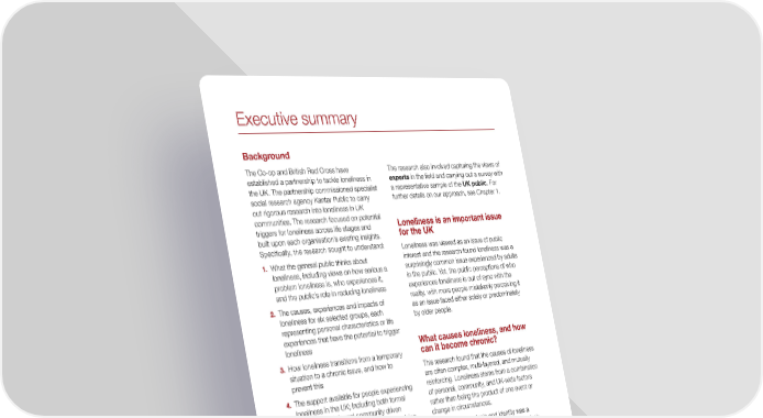 Executive summary Background The Co-op and British Red Cross have The research also involved capturing the views of established a partnership to tackle loneliness in experts in the field and carrying out a survey with the UK. The partnership commissioned specialist a representative sample of the UK public. For social research agency Kantar Public to carry further details on our approach, see Chapter 1. out rigorous research into loneliness in UK communities. The research focused on potential triggers for loneliness across life stages and Loneliness is an important issue built upon each organisation’s existing insights. for the UK Specifically, the research sought to understand:Loneliness was viewed as an issue of public 1. What the general public thinks about interest and the research found loneliness was a loneliness, including views on how serious a surprisingly common issue experienced by adults problem loneliness is, who experiences it, in the public. Yet, the public perceptions of who and the public’s role in reducing lonelinessexperiences loneliness is out of sync with the reality, with more people mistakenly perceiving it 2. The causes, experiences and impacts of as an issue faced either solely or predominately loneliness for six selected groups, each by older people. representing personal characteristics or life experiences that have the potential to trigger loneliness What causes loneliness, and how 3. How loneliness transitions from a temporary can it become chronic? situation to a chronic issue, and how to This research found that the causes of loneliness prevent this are often complex, multi-layered, and mutually 4. The support available for people experiencing reinforcing. Loneliness stems from a combination loneliness in the UK; including both formal of personal, community, and UK-wide factors services and informal community driven rather than being the product of one event or support, and any perceived gaps in provisionchange in circumstances. 5. What kind of support is needed to tackle The importance of role and identity was a loneliness, and what potential services recurring theme across our research; the lack users want. of identity or lack of clarity over assigned roles in society, for example caused by a life transition, was a key trigger for loneliness. When a person’s Who did we target for the research?identity or role was disrupted by an expected An initial literature review undertaken by the or sudden life event, this could cause an old partnership identified that loneliness is a identity to fall away and a new one with added widespread issue. There is much literature on responsibilities and burdens to appear. This loneliness in later life, but triggers for loneliness sometimes negatively affected the social across life stages is less well documented. connections of an individual – their friendships, Therefore, the research concentrated on acquaintances, family and colleagues. Our survey six target groups: young new mums (aged shows that 73% of those who stated they 18-24); individuals with mobility limitations; were always/often lonely fall within one of individuals with health issues; individuals who are the research target groups, which supports recently divorced or separated (within the last two the decision to include these groupings within the years); individuals living without children at home scope of the project. (‘empty nesters’) and retirees; and the recently bereaved (within the last six months to two years). Executive summary 6