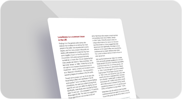 Loneliness is a common issue rather that those older people surveyed reported in the UK comparatively lower rates of feeling “always or often” lonely. Whilst the research does not Findings from the general public survey also categorically evidence the reasons for this lower indicate that loneliness is something that most reported prevalence, it does suggest that older people in the public have experienced to some age groups were significantly more likely to know degree, and that many people in the public are where to turn for support if they were experiencing dealing with loneliness at a level that may have loneliness and our expert witnesses also noted some negative impact on their life experience. that current loneliness services tended to focus on Around half of UK adults surveyed feel lonely older age groups. ‘sometimes’ or more often; it is an experience that many people can relate to. More worryingly, 18% Self-reported loneliness was higher than average feel lonely ‘always’ or ‘often’. Whilst the survey did (18% among the general population) for 5 of our 6 not capture any measure of perceived harm or target groups (it should be noted that respondents impairment – and is certainly not intended to serve could be in more than one of these groups), and as a ‘diagnosis’ of loneliness – this represents a in fact 73% of those who claimed to be ‘always’ surprising degree of loneliness in the UK public. or ‘often’ lonely belonged to one of the research target groups. Percentages of people ‘always’ Though some groups, such as 16-24 year olds, or ‘often’ lonely were highest for those who were those living on their own, and those in the DE recently divorced or separated (33%); had long- 10 social grades were more likely to express feelings term physical / mental health conditions (32%); of loneliness, this was least evident among those were people with mobility issues (30%); people aged 55 and over (and within this slightly, but not with limited access to transport (29%); people significantly, lower levels were recorded by those experiencing bereavement in the last two years aged 70 and over – 6% compared to 11% among 112 (19%); and parents of young children (32%). those aged 55-69). This does not suggest that those aged 55 and over are less lonely but Whilst there was still evidence of self-reported loneliness among those aged 55 and over, among those in this group who are either retired, or do not 10 Social grading is a standard classification based on the occupation of the chief income earner in a household. Those in the DE social grades are generally working in semi-skilled or unskilled 112Base sizes for this group were very small given low incidence in manual occupations, retired, or entirely dependent on the general population; further work would need to be conducted to state benefits. confirm prevalence of loneliness. Figure 3. Prevalence of loneliness in the UK general public Higher % always/often among: 1 4 16-24 – 32% 20 14 Children in household – 22% DE social grade* – 24% People living on own – 26% 18 Always Often Lower % always/often among: (% always/often) 55+ – 10% Sometimes 28 34 Rarely No difference in % always/often by: Never Gender, urban/rural, region Don't know Source Q1: How often do you feel lonely, if at all. Base: All UK adults aged 16+ (2,523). Loneliness is an important issue for the UK 17