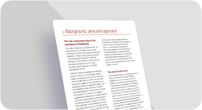 1. Background, aims and approach The role connections play in the At the outset, it is key to stress that as the experience of loneliness existing body of literature in the area suggests, loneliness is not synonymous with being Our social connections are fundamental to our alone, nor does being in the presence of daily experience, to the ways that we make others automatically protect individuals from meaning in our lives and to quality of life and life experiencing feelings of loneliness. Rather, satisfaction. At best, being socially connected loneliness is best described as the distressing – and having roles to play with the friends, feeling that individuals experience when a colleagues, family members, neighbours, and person’s network of social relationships with even casual acquaintances in our lives – others is less satisfying than they desire in either provides a sense of purpose, comradery, 8 quality or quantity. belonging and identity. Conversely, lacking meaningful and satisfying social connections has surprisingly powerful The need to learn more negative consequences across the mental and The partnership began by conducting a literature physical health spectrum. When we are lonely, review on loneliness and social isolation to we are less resistant to external stressors, our highlight some of the key factors or risks of bodies find it harder to repair themselves1, and loneliness, and identify groups of people who 2 life satisfaction is likely to be low. Cognitive might benefit from interventions. The evidence 3 4 functioning declines , and the risk of dementia confirmed the importance of loneliness as an 5 and depression increases. The evidence issue and the urgency for tackling it, yet, there suggests that feeling lonely or socially excluded remained gaps in the literature: loneliness and can have similar damaging consequences to isolation can have serious consequences, but 6 an individual’s health as obesity or smoking , there was a lack of rigorous, first hand evidence with longitudinal studies indicating increased from those experiencing loneliness based on risk of high blood pressure and the potential personal characteristics and life experiences, for heart-related diseases to develop. Perhaps and insight into the existing landscape of support most worryingly, the longitudinal evidence also available. Also unclear was what the impact indicates that loneliness can predict increased looks and feels like for people living with social 7 morbidity and mortality. disconnection. There was little substantive evidence that systematically explored what was needed to make positive change from the perspective of the people most in need. And 1 Hawley, L.C and Cacioppo J.T, (2010) “Loneliness Matters: there was a lack of evidence available from A Theoretical and Empirical Review of Consequences and Mechanisms”, Annals of Behavioural Medicine, 40, 218-27 people who experienced loneliness about what 2 Thomas, M, (2015) “New Perspectives on Loneliness: Developing might help to prevent loneliness from occurring Theory, Methodology and Evidence for Practice”, Seminar Series, in the first place, and how to prevent temporary Campaign to End Loneliness 3 Steptoe, A. et al, (2013) “Social Isolation, Loneliness and All–cause situations from transitioning into chronic states. Mortality in Older Men and Women”, Proceedings of the National Academy of Sciences of the United States of America, 110, 5797-5801To ensure that its own future activity was grounded 4 Holwerda, J. et al, (2012) “Feelings of Loneliness, but not social in rigorous, robust, and participatory evidence, the isolation predict dementia onset: results from the Amsterdam Study of the Elderly, Journal of Neurology, Neurosurgery and Psychiatry, partnership commissioned substantive research 85, 135-142 about loneliness in the UK. Conducted by Kantar 5 Hawley, L.C and Cacioppo J.T, (2010) “Loneliness Matters: A Theoretical and Empirical Review of Consequences and 9 Public , a specialist independent social research Mechanisms”, Annals of Behavioural Medicine, 40, 218-27 6 Holt-Lundstad, J, Smith T.B and Layton, J.B (2010) Social relationships and mortality risk: a meta-analytic review, PLo Med. doi 10.1371/journal.pmed.1000316 7 Perlman, D and Peplau, L.A, “Loneliness Research: A Survey 8 Bernard, S, (2013)”Loneliness and Social Isolation Among Older of Empirical Findings” (1974) in Peplau, L.A & Goldston, S (Eds), People in North Yorkshire”, WP2565,1-51 Social Policy Research “Preventing the harmful consequences of severe and persistent Unit, University of York, York loneliness”, 13-46 Washington DC: U.S. Government Printing Office9 http://www.kantar.com/public/ Background, aims and approach 12