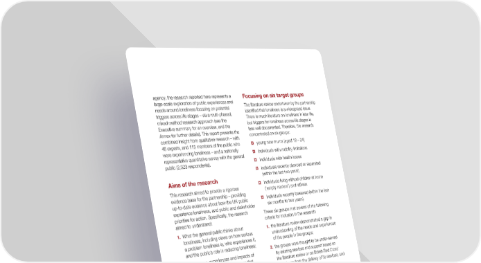 agency, the research reported here represents a Focusing on six target groups large-scale exploration of public experiences and needs around loneliness focusing on potential The literature review undertaken by the partnership triggers across life stages – via a multi-phased, identified that loneliness is a widespread issue. mixed method research approach (see the There is much literature on loneliness in later life, Executive summary for an overview, and the but triggers for loneliness across life stages is Annex for further details). This report presents the less well documented. Therefore, the research combined insight from qualitative research – with concentrated on six groups: 45 experts, and 115 members of the public who young new mums (aged 18 – 24) ¤ were experiencing loneliness – and a nationally individuals with mobility limitations representative quantitative survey with the general ¤ individuals with health issues public (2,523 respondents).¤ individuals recently divorced or separated ¤ Aims of the research (within the last two years) individuals living without children at home This research aimed to provide a rigorous ¤ (‘empty nesters’) and retirees evidence base for the partnership – providing individuals recently bereaved (within the last up-to-date evidence about how the UK public ¤ experience loneliness, and public and stakeholder six months to two years). priorities for action. Specifically, the research These six groups met several of the following aimed to understand: criteria for inclusion in the research: 1. What the general public thinks about 1. the literature review demonstrated a gap in loneliness, including views on how serious understanding of the needs and experiences a problem loneliness is, who experiences it, of the people in the groups; and the public’s role in reducing loneliness; 2. the groups were thought to be under-served 2. The causes, experiences and impacts of by existing services and support based on loneliness – for six selected groups that the literature review or on British Red Cross’ each represent personal characteristics or experience from the delivery of its services; and life experiences that have the potential to trigger loneliness; 3. occurred in high enough numbers in the general public to make research feasible – 3. How loneliness transitions from a temporary i.e. the group could be identified and recruited situation to a chronic issue – and how to to the research. prevent this; Full sampling details, as well as the recruitment 4. The support available for people experiencing screeners used to define each group, are loneliness in the UK, including both formal included in the Annex. services and informal community driven support, and any perceived gaps in provision; and 5. What kind of support is needed to tackle loneliness, and what potential service users want. Background, aims and approach 13