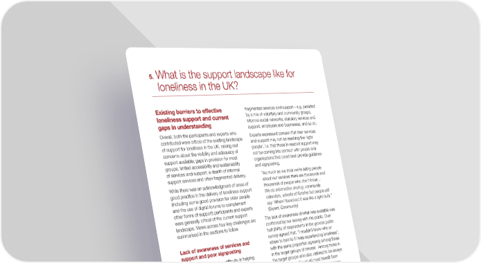 5. What is the support landscape like for loneliness in the UK? Existing barriers to effective fragmented services and support – e.g. provided loneliness support and current by a mix of voluntary and community groups, gaps in understanding informal social networks, statutory services and support, employers and businesses, and so on. Overall, both the participants and experts who Experts expressed concern that their services contributed were critical of the existing landscape and support may not be reaching the ‘right of support for loneliness in the UK, raising real people’, i.e. that those in need of support may concerns about the visibility and adequacy of not be coming into contact with people and support available; gaps in provision for most organisations that could best provide guidance groups; limited accessibility and sustainability and signposting. of services and support; a dearth of informal support services and often fragmented delivery. “As much as we think we’re telling people While there was an acknowledgment of areas of about our services there are thousands and thousands of people who don’t know… good practice in the delivery of loneliness support (including some good provision for older people We do information sharing, community and the use of digital forums to complement calendars, adverts at libraries but people still other forms of support) participants and experts say ‘When I found out it was like a light-bulb.” were generally critical of the current support (Expert, Community) landscape. Views across four key challenges are The lack of awareness of what was available was summarised in the sections to follow.confirmed by our survey with the public. Over half (54%) of respondents in the general public Lack of awareness of services and survey agreed that: “I wouldn’t know who or support and poor signposting where to turn to if I was experiencing loneliness”, with the same proportion agreeing among those Experts noted that a key difficulty in helping in the target groups of interest. Among those in people to access the support they needed the target groups who also claimed to be always was ensuring that services and support were or often lonely, who would most benefit from effectively promoted and visible. This could be support, 75% agreed that they wouldn’t know particularly challenging in an environment of where to turn for help. Figure 11. Individual-level drivers of loneliness% agree Any target group (total)54 Have limited access to transport 66 Long-term physical/mental health conditions/illnesses59 Health issues impacting ability to get around59 Aged 35+ divorced/separated in last 12 months55 Source Q4: How much Experienced bereavement in last 2 years54do you agree or disagree Aged 55+ and retired 46 that: I wouldn’t know who or where to turn to if I was Aged 55+ with no children at home44 experiencing loneliness? Any target group AND always/often lonely Base: All UK adults aged 75 16+ (2,523) What is the support landscape like for loneliness in the UK? 34