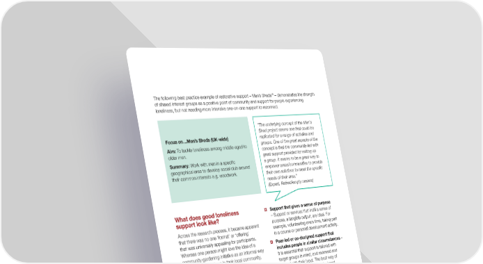18 The following best practice example of restorative support – Men’s Sheds – demonstrates the strength of shared interest groups as a positive point of community and support for people experiencing loneliness, but not needing more intensive one-on-one support to reconnect. “The underlying concept of the Men's Shed project seems one that could be Focus on…Men’s Sheds (UK-wide) replicated for a range of activities and Aim: To tackle loneliness among middle-aged to groups. One of the great aspects of the older men. concept is that it is community-led with great support provided for setting up Summary: Work with men in a specific a group. It seems to be a great way to geographical area to develop social club around empower areas/communities to provide their common interests e.g. woodwork. their own solutions to meet the speciic needs of their area.” (Expert, Retired/empty nesters) What does good loneliness Support that gives a sense of purpose ¤ support look like? – Support or services that instil a sense of Across the research process, it became apparent purpose, a tangible output, are ideal. For that there was no one ‘format’ or ‘offering’ example, volunteering one’s time, taking part that was universally appealing for participants. in a course or personal development activity. Peer-led or co-designed support that Whereas one person might love the idea of a ¤ community gardening initiative as an informal way includes people in similar circumstances – to connect with others in their local community, It is essential that support is tailored with another might reject this as ‘too formal’ or target groups in mind, and reviewed and unappealing. Whilst some participants wanted revised with their input. The best way of services and support to be peer-led, others achieving this is seen as co-designed felt that having more formal ‘hosting’ might be approaches to service development, drawing beneficial. However, two key findings emerged on the lived experiences of the very people from across the research: 1) some principles of the service or support hopes to engage with. ‘best practice’ in providing services and 2) an Local to individuals and easy to access – ¤ interest in face-to-face services and support. Accessibility is seen as key for engaging with support users and encouraging people to use support on a regular rather than ad hoc basis. Overarching principles of effective Centrally located or easily accessible venues loneliness support are preferred. Drawing together insight from across the Free or affordable support – Where ¤ research, there are eight key principles that possible, providing free or subsidised support underpin participant and expert responses as is key for maximising engagement and to what good support looks like. Support that encouraging individuals to approach support embodies multiple principles is seen as more and continue to utilise it. effective in responding to the needs of its users. Support that instils a sense of identity for The principles of best practice support are: ¤ participants – This type of support looks to positively frame an individual’s identity and 18 http://menssheds.org.uk/ empower them. What kind of support do people want and how do they want support delivered? 41